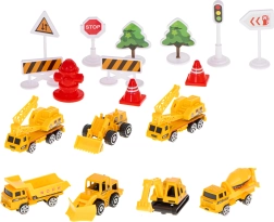 Rinkinyje yra ekskavatorius, betono maišyklė, buldozeris, savivartis, kranas ir kitos transporto priemonės, papildytos ženklais, kūgeliais ir medeliais savoms statybų aikštelėms kurti.