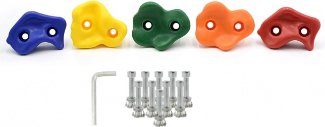 Šiame rinkinyje yra penki tvirti ir patvarūs laipiojimo laikikliai, kurių maksimali apkrova iki 100 kg. Idealiai tinka montuoti ant modernių vaikų žaidimų aikštelių ir lauko žaidimų erdvių.