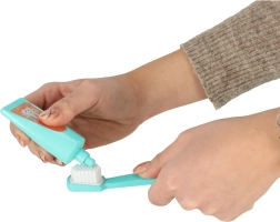 • Viskas vienoje pakuotėje: begemotas su išimamais dantimis, šepetėlis, pasta, veidrodėlis, švirkštas, pincetas, skaleris, „grąžtelis“, 2 atskiri dantukai ir mokomosios kortelės anglų k.