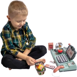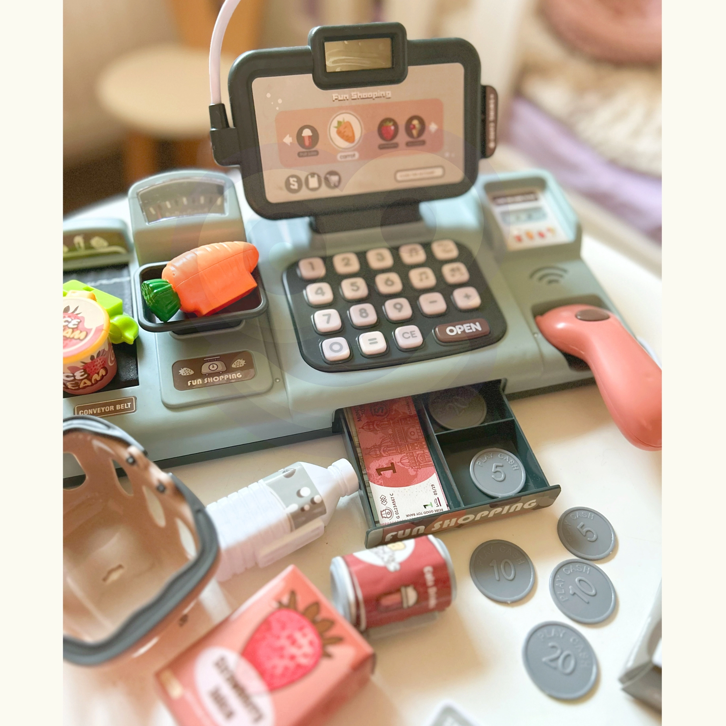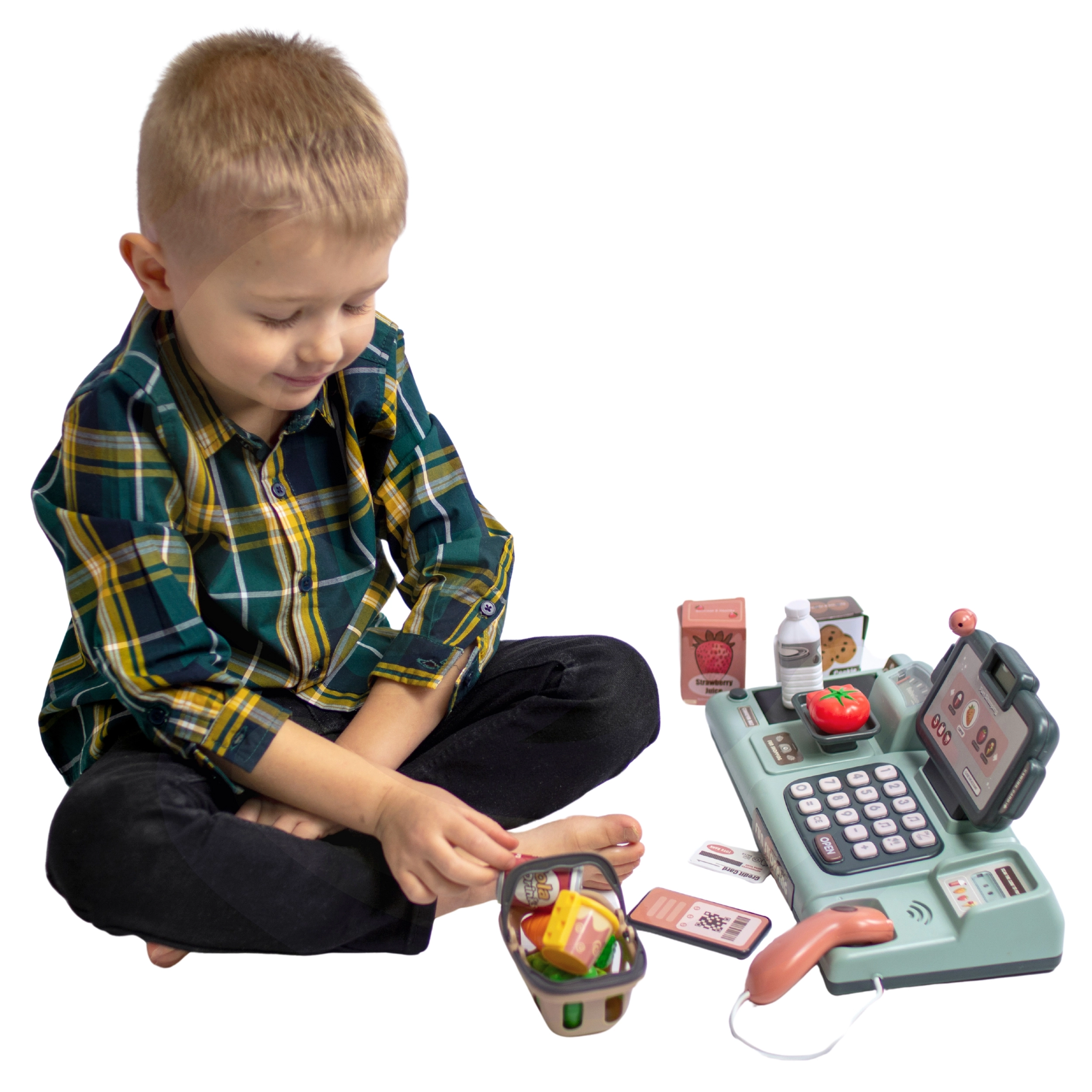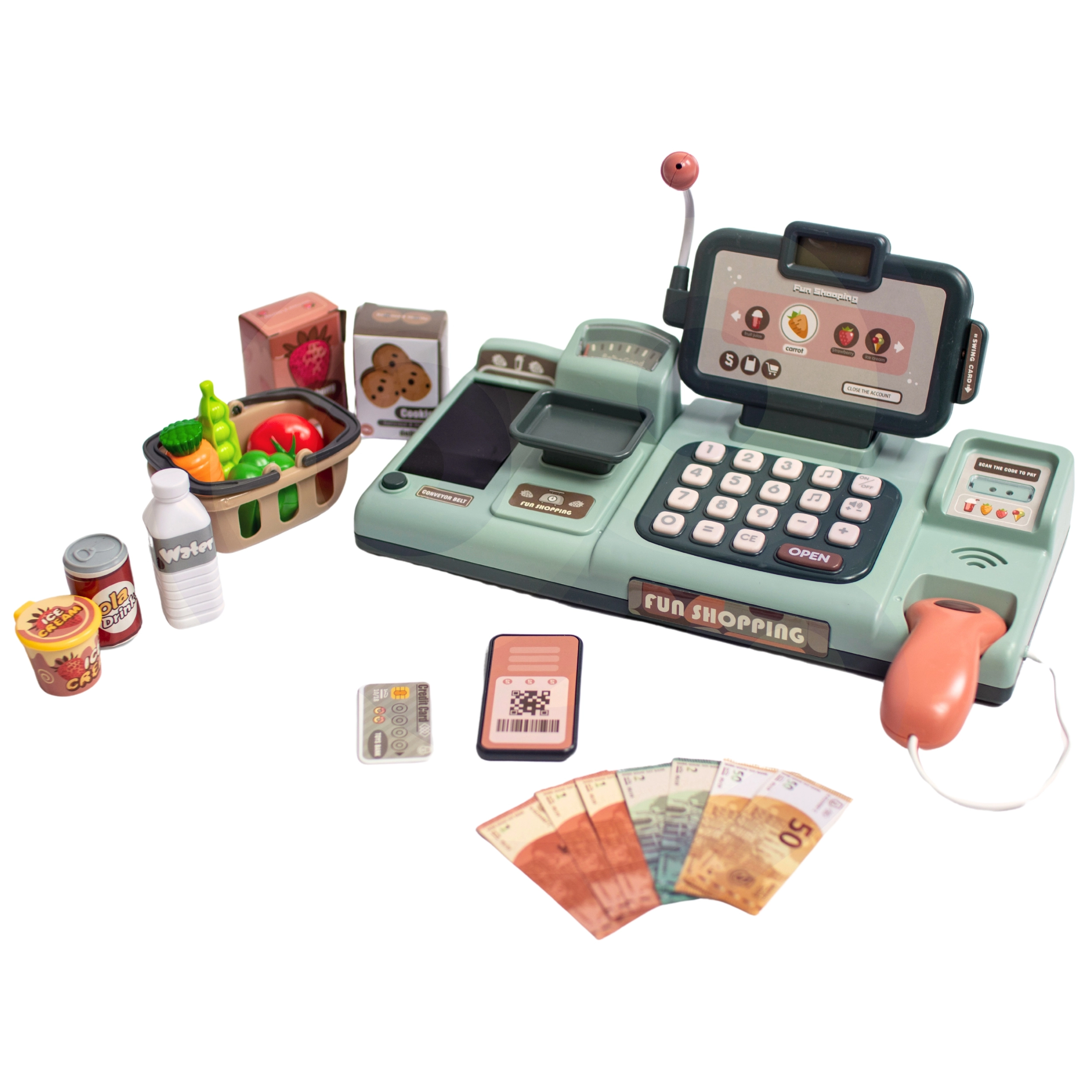 Kasoje yra terminalas, kurio dėka vaikas gali atlikti mokėjimus grynaisiais, kortele arba išmaniuoju telefonu – kaip suaugusieji parduotuvėje. Integruotos svarstyklės ir judanti juosta leidžia vaikui sutvarkyti pirkinius ir pasijusti tikru pardavėju.