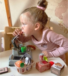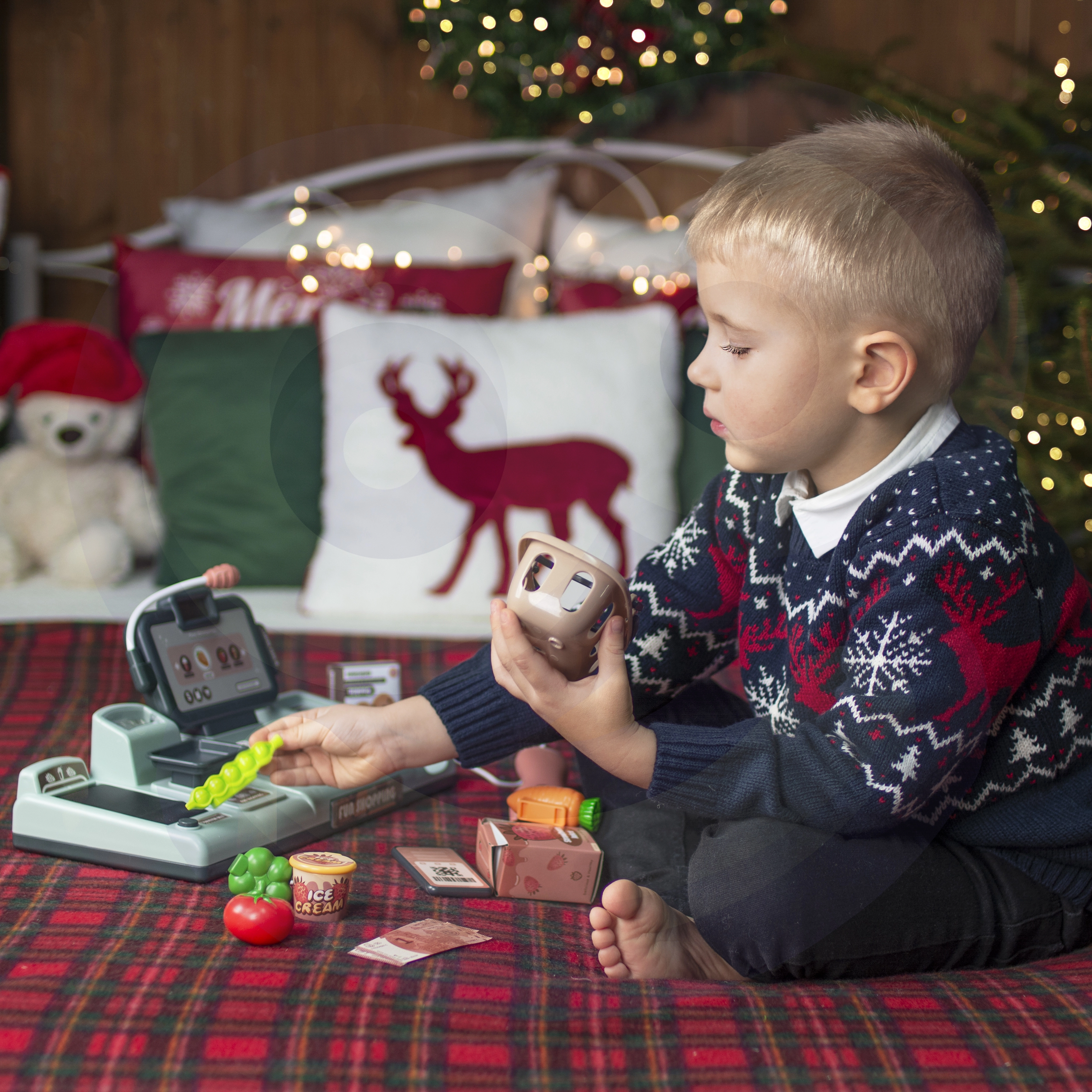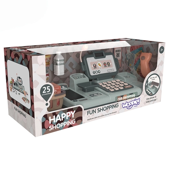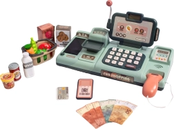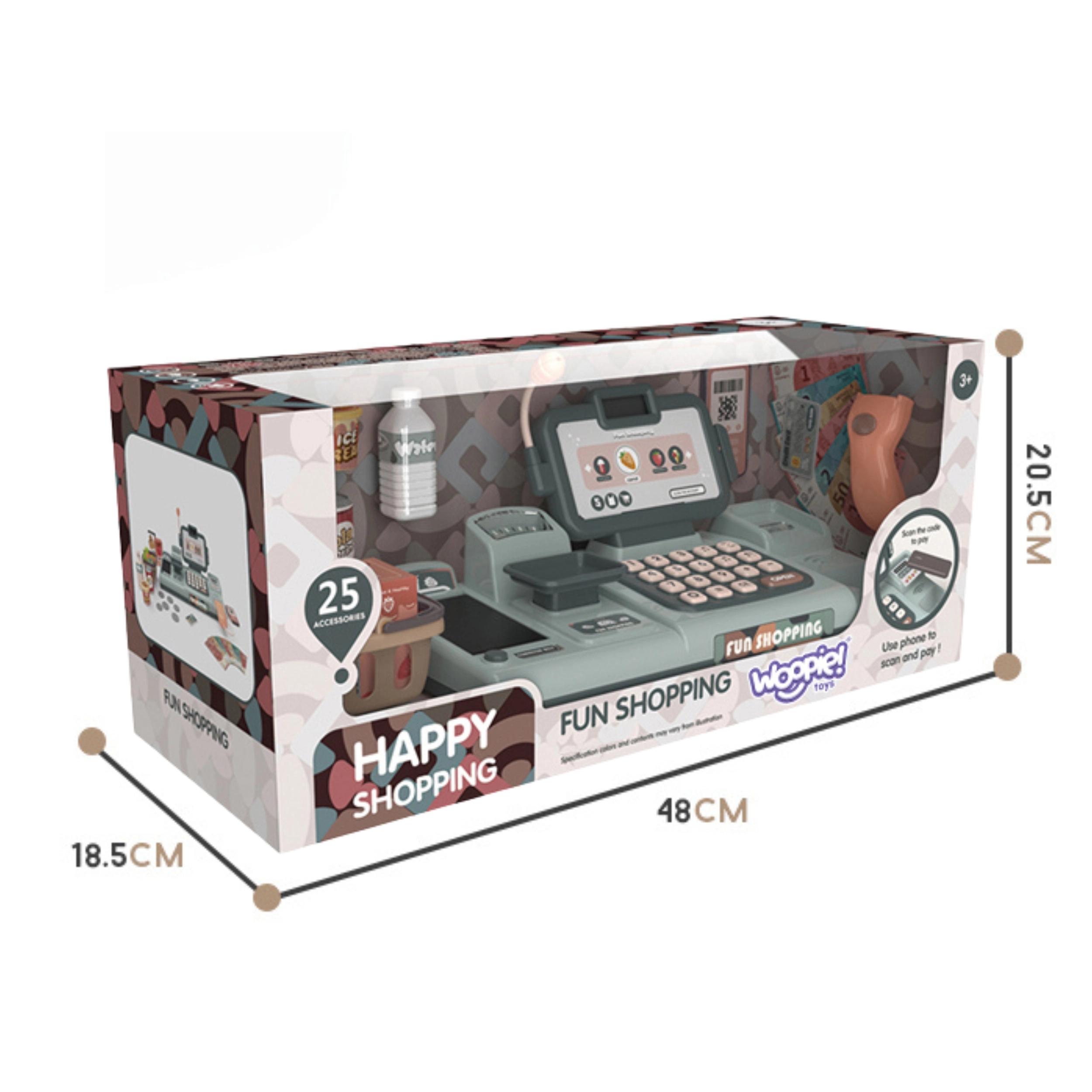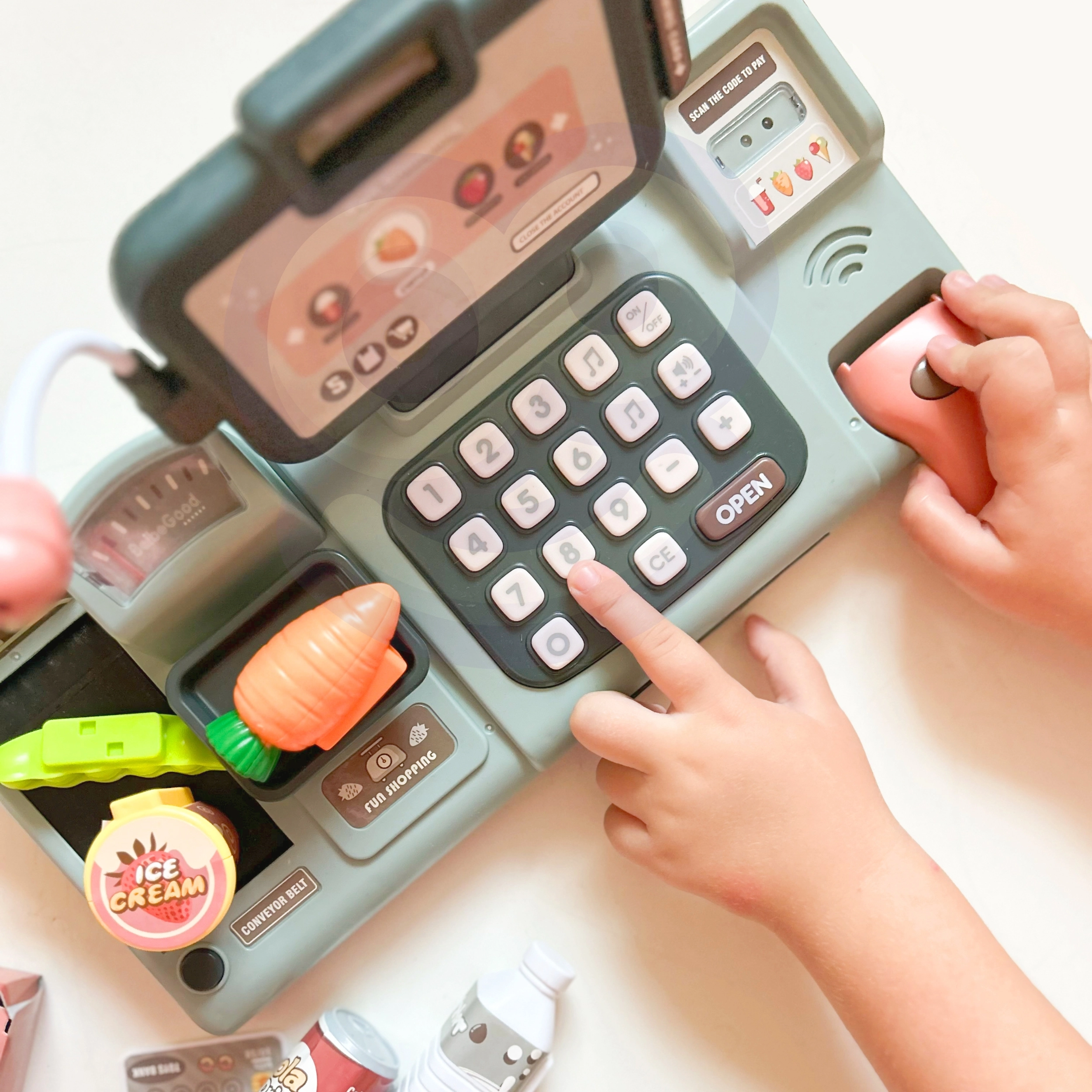 Kasoje yra terminalas, kurio dėka vaikas gali atlikti mokėjimus grynaisiais, kortele arba išmaniuoju telefonu – kaip suaugusieji parduotuvėje. Integruotos svarstyklės ir judanti juosta leidžia vaikui sutvarkyti pirkinius ir pasijusti tikru pardavėju.
