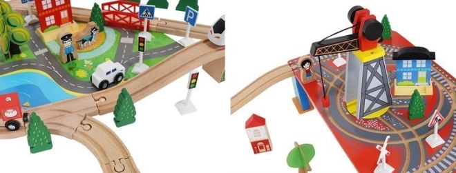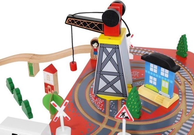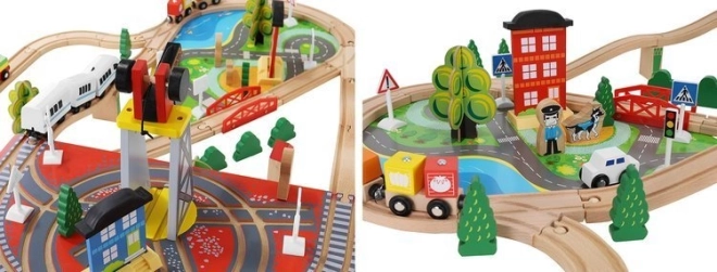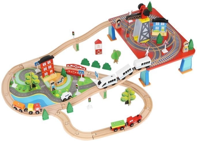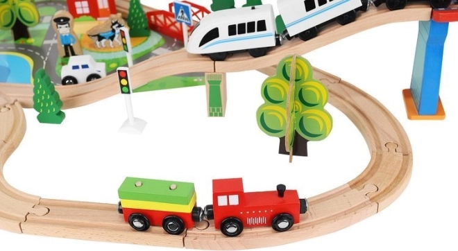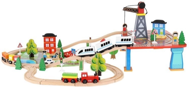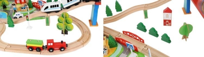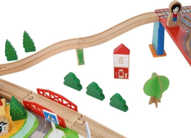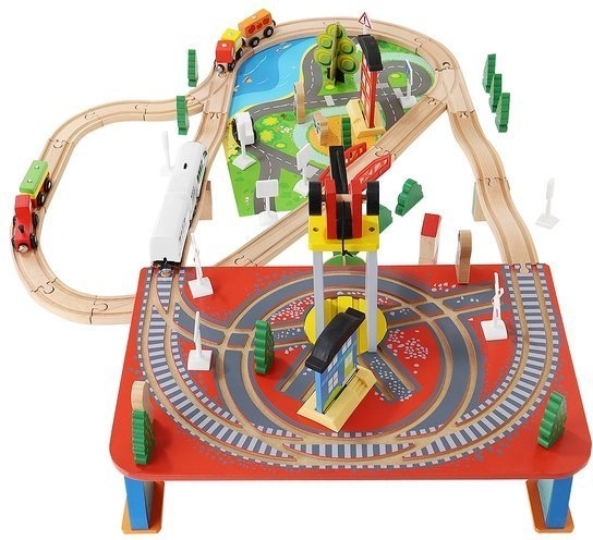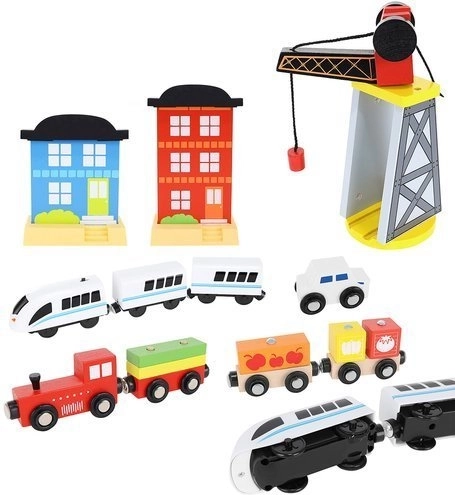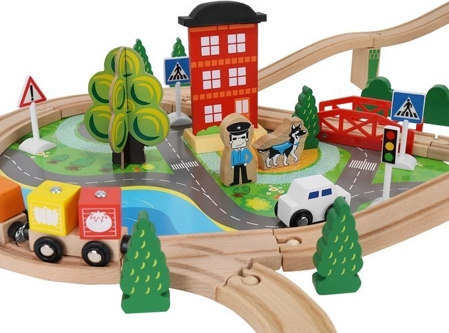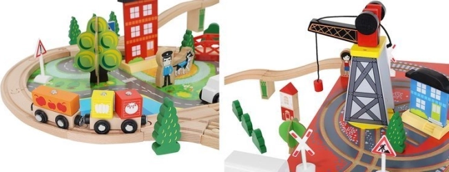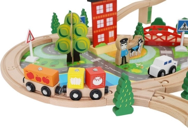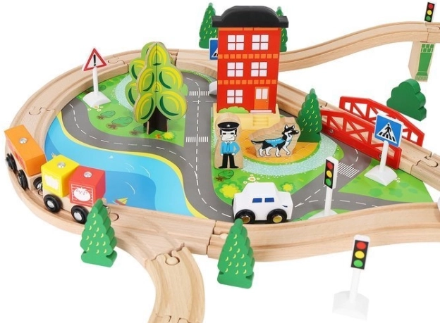 Medinė traukinių trasa su iš viso 88 preciziškai pagamintais elementais, įskaitant geležinkelį, krovininį ir keleivinį traukinį, automobilį, medelius ir kelio ženklus. Pramoga slypi galimybėje susikurti savo maršrutą, o magnetiniai jungimai užtikrina lengvą naudojimą.