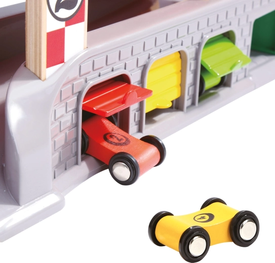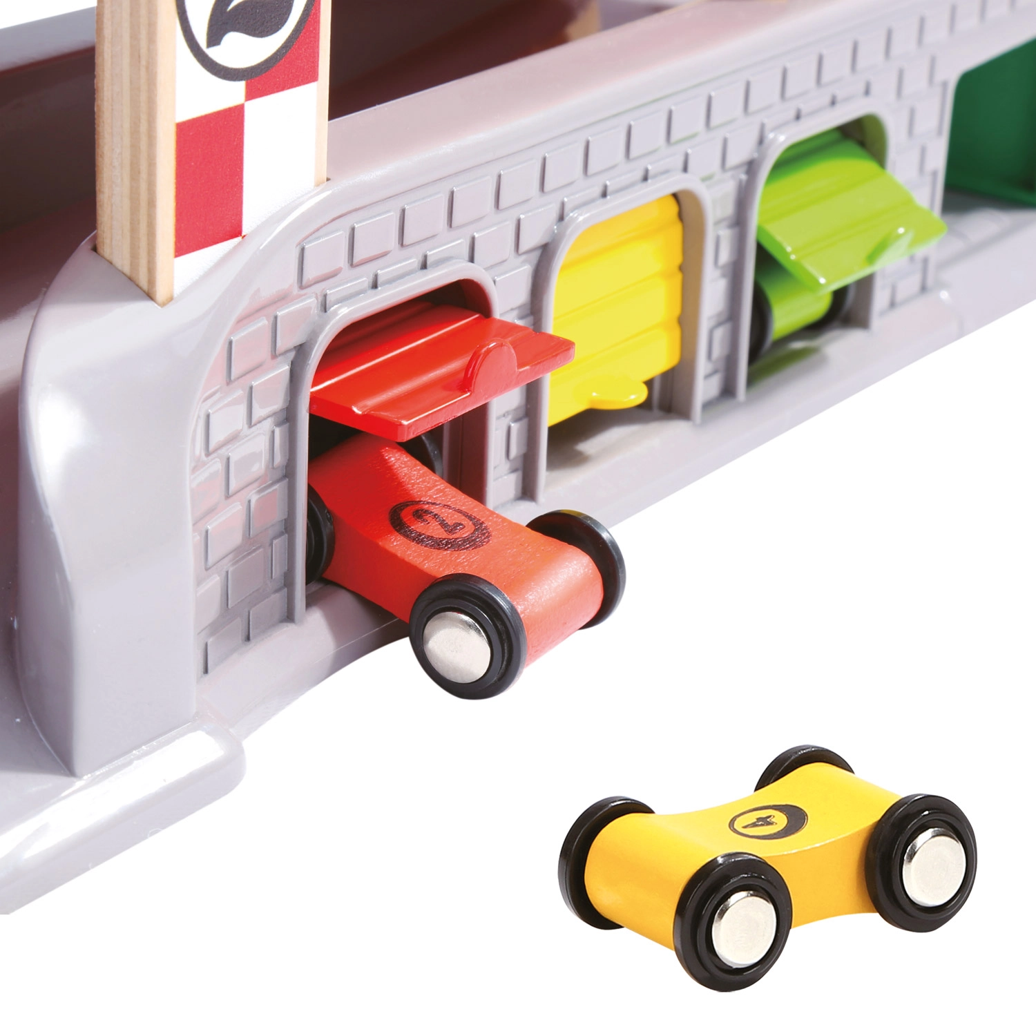 Leiskitės į lenktynes pilnu tempu su trasa, kurioje yra dvi starto platformos, kuro papildymo boksai ir trys garažai su atidaromomis durelėmis. Tvirta medžio, plastiko ir metalo kombinacija užtikrina patvarumą, o ryškios spalvos traukia dėmesį ir skatina vaizduotę. Rinkinyje yra 4 skirtingų spalvų automobiliukai nesibaigiančiam lenktynių džiaugsmui.