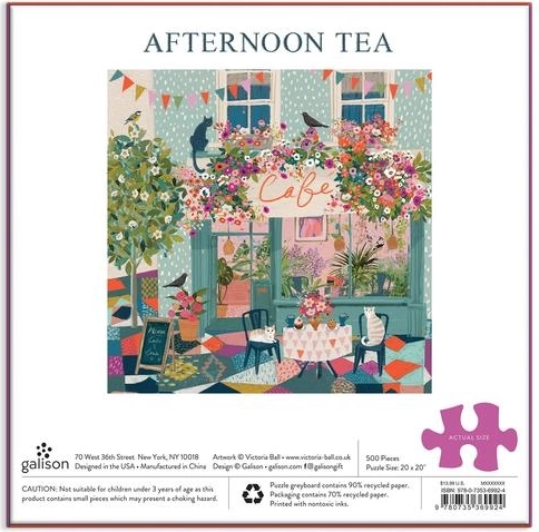 Atsipalaiduokite dėliodami gražų motyvą, sukurtą menininkės Victorios Ball – gatvės kavinę, pilną gėlių, kačių ir paukščių. Ši kokybiška 500 dalių dėlionė pasižymi aukščiausia kokybe, tiksliai besijungiančiomis dalimis ir yra atspausdinta netoksiškais dažais ant perdirbto popieriaus.