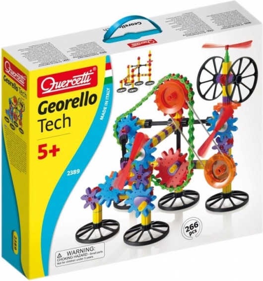 Georello Tech konstruktorius perduoda sukamąjį judesį tarp nutolusių pavarų ir aiškiai parodo pagrindines mechanines funkcijas, panašias į tas, kurias rasite tikruose įrenginiuose. Dėl grandinės ir elastinio dirželio vaikai gali sujungti krumpliaračius per didesnį atstumą ir kurti dar sudėtingesnes konstrukcijas.
