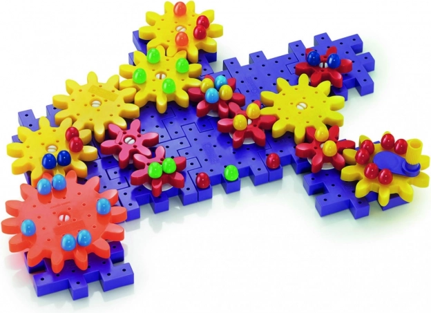 Spalvotų krumpliaračių ir figūrėlių rinkinys leidžia vaikams kurti įvairias struktūras ir linksmai susipažinti su mechanikos pagrindais.