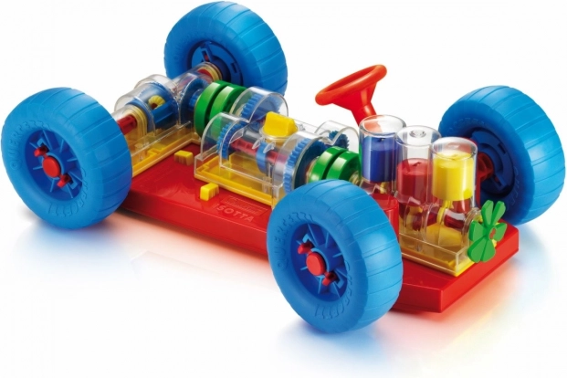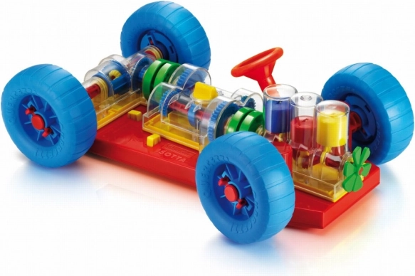 Sumanus žaislas, kuris tiesiog skatina vaikus ir jų tėvus sužinoti, kaip veikia tikras automobilis. Visos pagrindinės mechaninės funkcijos čia tiksliai atkartotos. Vaikai matys, kaip variklyje dirba cilindrai ir alkūninis velenas ir kaip jie sujungti su pavarų dėže, kuri turi veikiančią 3 padėčių pavarų perjungimo sistemą (neutralus, 1 ir 2 pavara). Diferencialas perduoda judesį galiniams ratams ir leidžia jiems suktis nepriklausomai vienas nuo kito. Visas mechanines dalis galima lengvai pritvirtinti prie važiuoklės ir taip pat lengvai atleisti specialiais spyruokliniais geltonais mygtukais. Veikiantis vairas leidžia automobiliui sukti arba įvažiuoti į stovėjimo vietą. Vaikai taip pat gali pakelti automobilį priekyje ir gale naudodami specialius vežimėlius, o sukdami rankenėlę ant priekinio iš jų – įjungti visą mechanizmą. Perjungiant atskiras pavaras jie pamatys, kaip keičiasi ratų ir cilindrų judėjimo greitis. Įjungus neutralią pavarą taip pat pastebės, kaip variklis ir diferencialas vienas nuo kito atsijungia. Skirta vaikams nuo 3 metų. Pagrindinės savybės: atkurtos pagrindinės mechaninės funkcijos, veikiantis vairas ir mechaninės dalys, tinka vaikams nuo 3 metų