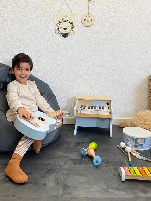 Surenkite namų koncertus su šiuo stilingu vaikišku būgneliu! Dėl reguliuojamo medvilninio dirželio, tylių lazdelių su garso slopintuvais ir tvirtos medinės konstrukcijos jis idealiai tinka pirmajam žingsniui į muzikos pasaulį. Skatina ritmą, akių–rankų koordinaciją ir smulkiąją motoriką, be to, puikiai atrodo vaiko kambaryje.