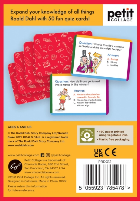 Tapkite Roaldo Dahlio istorijų meistru su viktorinos kortomis, kurios tikrina jūsų atmintį ir žinias. Rinkinyje yra 50 klausimų kortelių, kurios jums ir jūsų šeimai suteiks puikią pramogą namuose ar kelionėje. Dėl sero Quentino Blake’o iliustracijų kortos taip pat džiugina akį. Pagamintos iš 100% FSC sertifikuoto popieriaus ir spausdintos augaliniais dažais, jos atitinka griežtus ekologinius standartus.