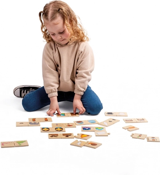 Vaikai sieja paveikslėlius, kurie atspindi priešingas reikšmes – pavyzdžiui, diena ir naktis, šilta ir šalta, liūdnas ir linksmas. Lygios, tvirtos detalės lengvai laikomos ir jungiamos, todėl mažos rankos gali susitelkti į naujų žodžių ir ryšių atradimą.