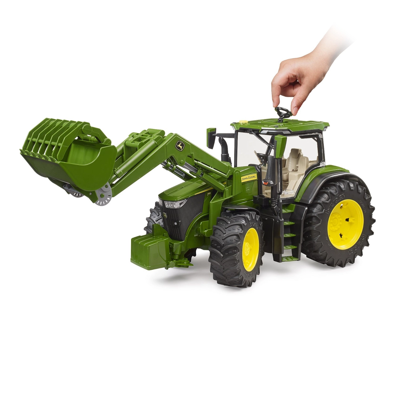 Traktorius John Deere 7R 350 su priekiniu krautuvu – puikus papildymas bet kokiai ūkininko kolekcijai. Realistiškas dizainas leidžia vaikams patirti žemės ūkį iš arti. Dėl atidaromų durų ir variklio dangčio galima apžiūrėti vidaus konstrukcijos detales.