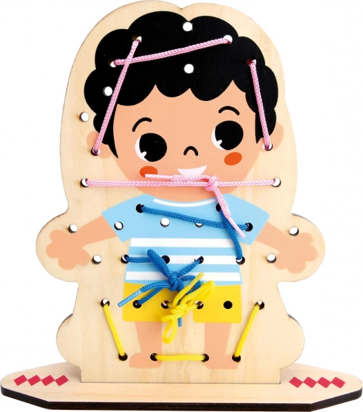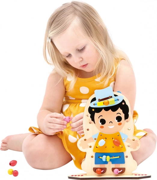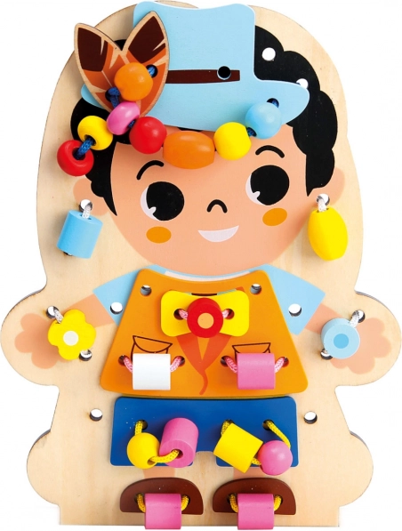 Atraskite kūrybišką medinį vėrimo žaidimą, kuris ilgam įtrauks vaikus ir kartu lavins jų įgūdžius. Iš abiejų pusių atspausdinta lentelė su personažu ir gausus priedų rinkinys skatina smulkiąją motoriką, rankos ir akies koordinaciją bei kūrybiškumą. Dėl 60 detalių vaikai lavina kantrybę, loginį mąstymą ir žaidimo forma mokosi problemų sprendimo.