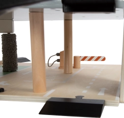 Į komplektą įeina dvi mašinėlės ir detalūs priedai: degalinė ir įkrovimo stotelė, keltuvas bei plovykla su tekstiliniais šepetėliais. Tvirta konstrukcija iš storos medinės faneros su masyvinės medienos elementais ir saugiu plastiku užtikrina stabilumą ir atsparumą. Produktą reikia surinkti; pakuotėje yra iliustruota instrukcija.