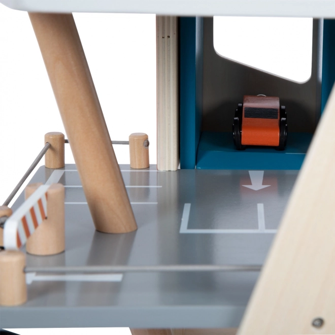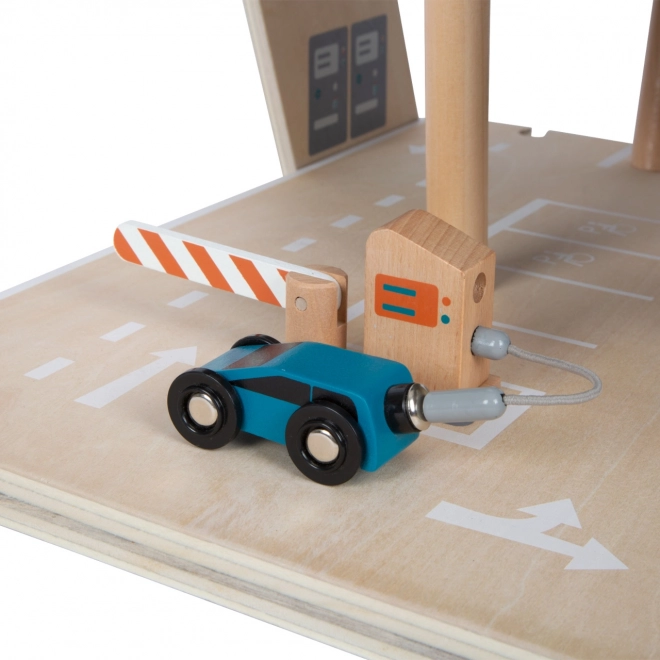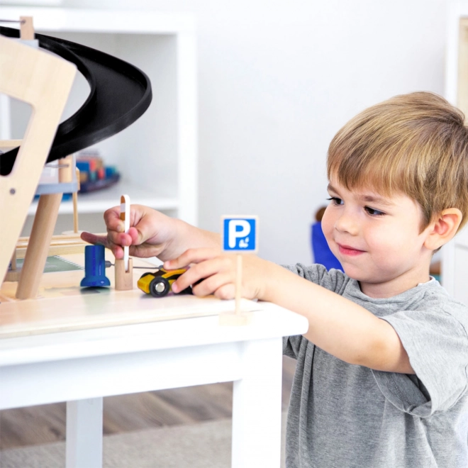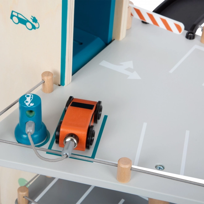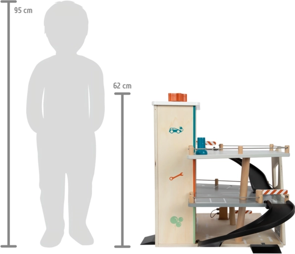 Šis stilingas medinis lenktynių parkingas vaikams suteikia turtingą žaidimų pasaulį. Trys aukštai sujungti funkciniu liftu ir dviem sklandiomis rampomis, leidžiančiomis mašinėlėms judėti be trukdžių. Kiekviename aukšte įrengtos mechaninės užtvaros ir guminės atitvaros, kurios suteikia dinamikos ir apsaugo nuo transporto priemonių iškritimo. Spalvotos piktogramos ir kelio ženklai skatina mokymąsi žaidžiant ir lavina vaizduotę.