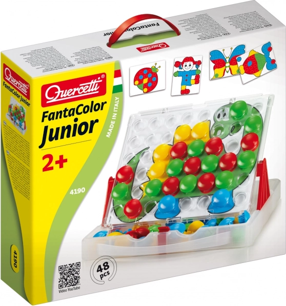 Atraskite kūrybinę mozaiką QUERCETTI FANTACOLOR JUNIOR, kuri lavina vaikų fantaziją ir smulkiąją motoriką. Dėl didelių „kepurėlių“ vaikams lengva jas suimti, praktiškas lagaminėlis viską laiko tvarkingai, o 8 dvišalės kortelės įkvepia kūrybai. Žaislas skatina spalvų atpažinimą, akies ir rankos koordinaciją, sutelktą dėmesį ir kantrybę.