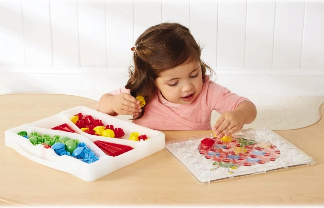 Mozaika praktiškame lagaminėlyje leidžia vaikams dėlioti linksmus paveikslėlius pagal pridėtas šablonų korteles arba pagal savo fantaziją. Lentą galima įstatyti į atramas ir naudoti vertikalioje padėtyje dar patogesniam žaidimui. Didelės, spalvingos „kepurėlės“ yra saugios ir lengvai sugriebiamos net mažoms vaikų rankoms.