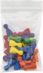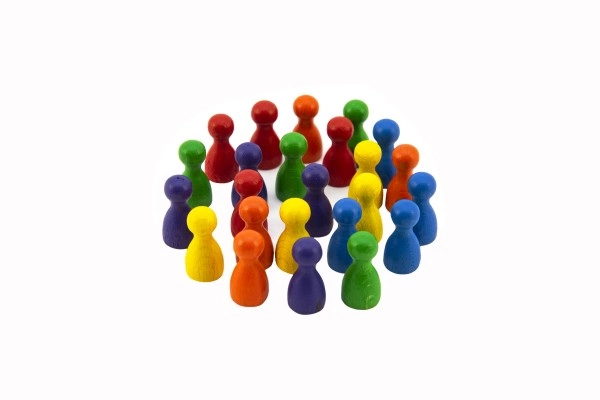 Rinkinys medinių figūrėlių šešiomis ryškiomis spalvomis, idealiai tinka žaidimui Čovek, nepyk! patobulinti.