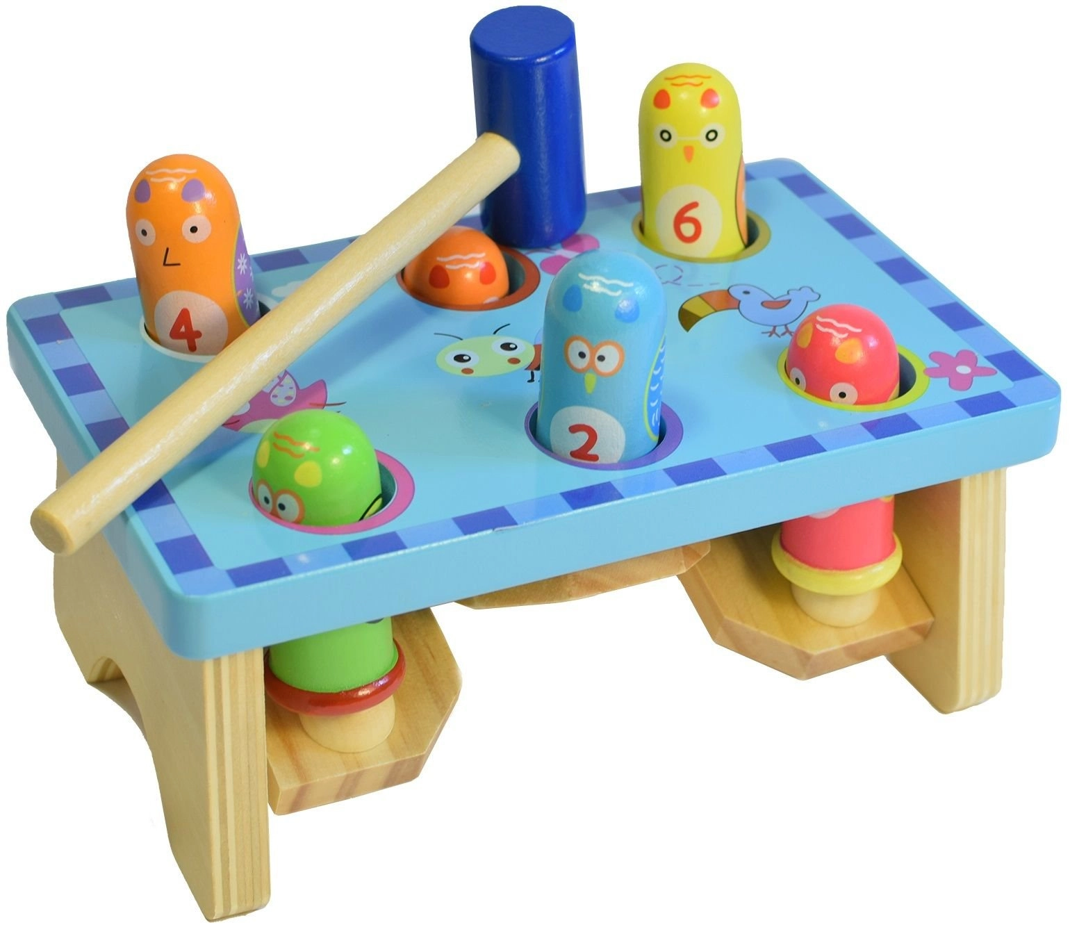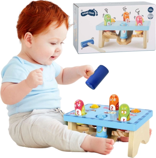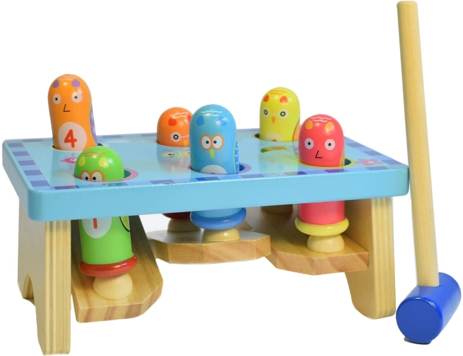 Dėl tvirto apdirbimo ir ergonomiško plaktuko vaikai lavina smulkiąją motoriką, judesių koordinaciją ir kantrybę. Spalvoti ir sunumeruoti kaiščiai padeda atpažinti spalvas ir skaičiuoti, tad žaidimas natūraliai susilieja su mokymusi.