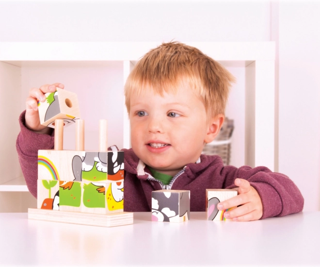 Rinkinyje iš viso 10 dalių – 9 kaladėlės, iš kurių sudedami 4 skirtingi paveikslėliai, ir medinis pagrindas su strypeliais saugiam ir patogiam dėliojimui. Žaislas pagamintas iš patvarios medienos su lygiu paviršiumi ir atitinka aktualius Europos saugos standartus.