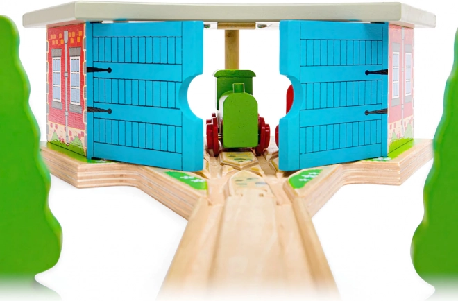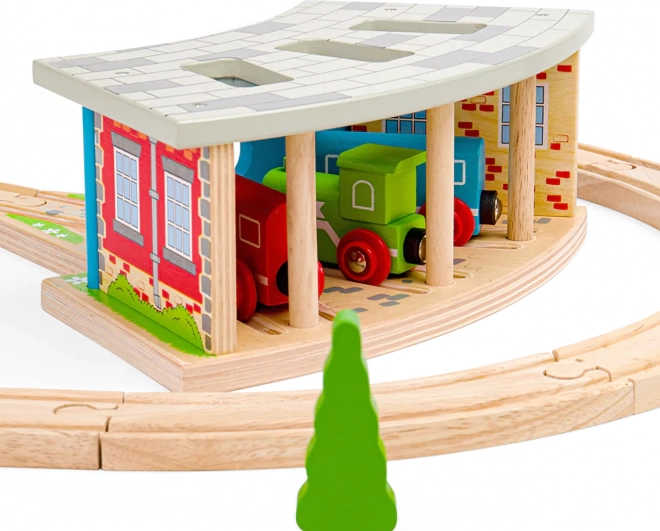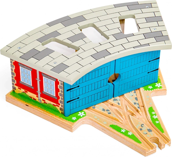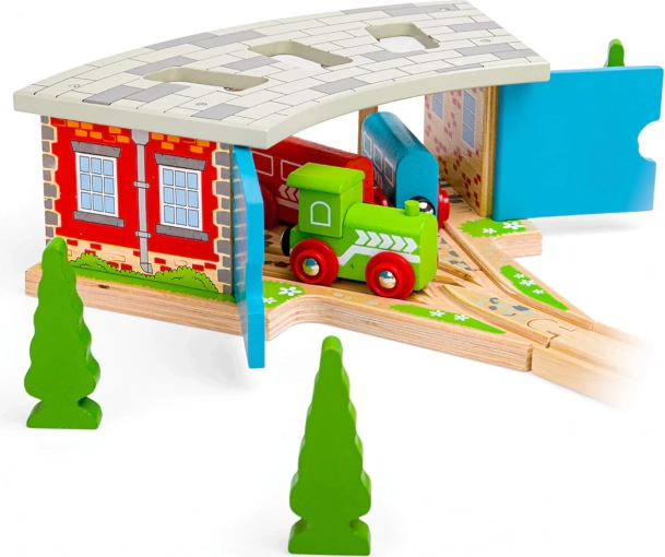 Trigubas depas su vartais – idealus priedas kiekvienam mažajam mašinistui. Dėl trijų stovėjimo vietų ir integruoto bėgių prijungimo lengvai suorganizuosite eismą trasoje ir saugiai pastatysite traukinukus po dienos, pilnos važiavimo. Tvirta medinė konstrukcija su spalvingomis detalėmis atrodo realistiškai ir atlaiko intensyvų žaidimą.