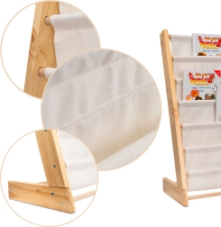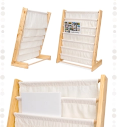 Stilinga vaikiška Montessori stiliaus lentyna su tekstilinėmis kišenėmis užtikrina lengvą prieigą prie mėgstamų knygelių, tvarkingą laikymą ir saugų naudojimą. Natūrali mediena ir kokybiškas medvilninis audinys kuria patvarų ir laiko nepavaldų baldą, kuris skatina vaiko savarankiškumą ir palaiko tvarką vaikų kambaryje.