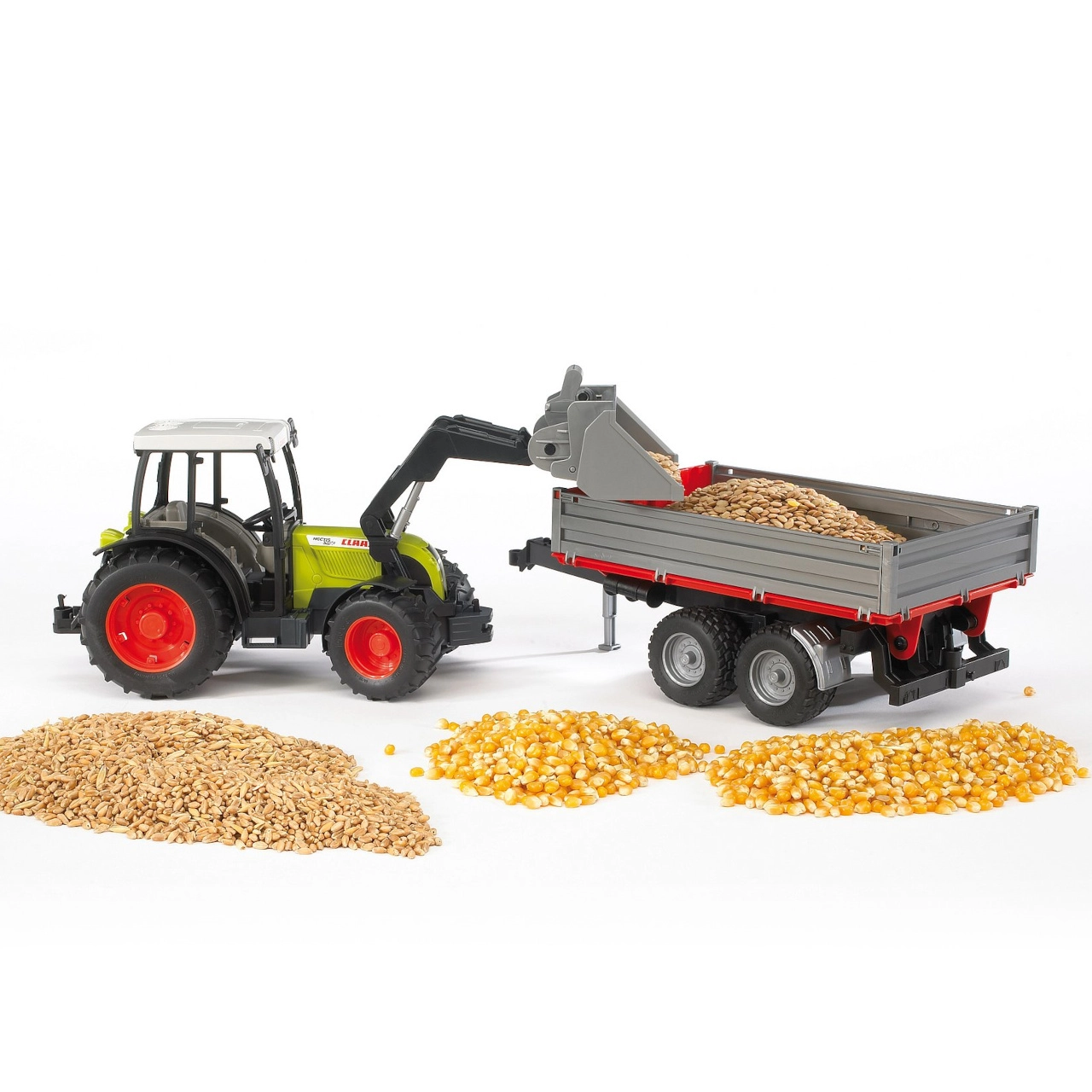 Realistiškas žemės ūkio rinkinys mažiesiems ūkininkams: traktorius CLAAS Nectis 267F su pilnai funkcionaliu priekiniu krautuvu ir dviaše savivarčio tipo priekaba. Siūlo tvirtas protektorines padangas, atidaromą variklio dangtį, įstiklintą kabiną ir antrinį vairavimą per stogą, kad būtų lengva valdyti. Pagaminta Vokietijoje iš kokybiško plastiko, mastelis 1:16.
