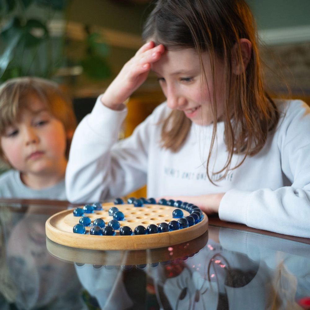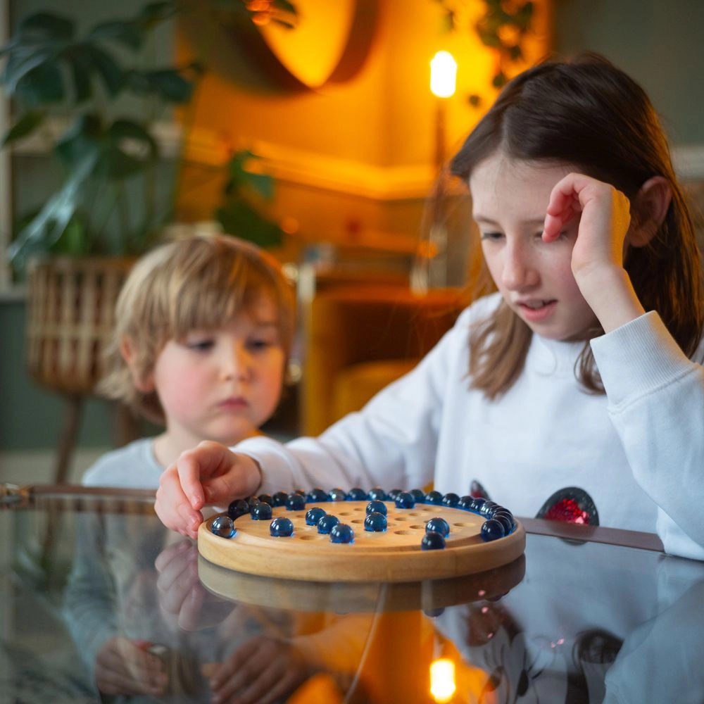 Klasikinis medinis solitaire su 32 stikliniais rutuliukais ant apvalios lentos lavina logiką, strateginį mąstymą ir susikaupimą nuo ankstyvo amžiaus. Pagaminta iš aukštos kokybės tvarios medienos, atitinka Europos saugos standartus ir idealiai tinka ramiam vieno žaidėjo žaidimui.