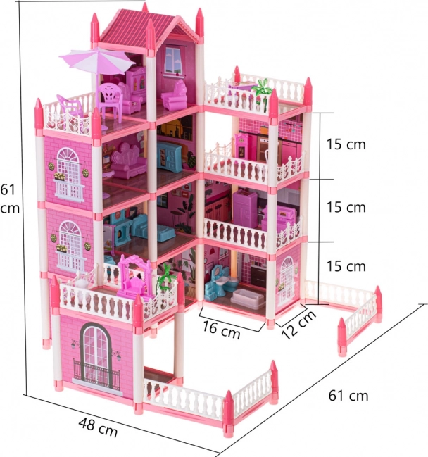 Rožinė lėlių vila turi keturis aukštus, kurie siūlo įtraukiamus ir įvairius kambarius tyrinėjimui.