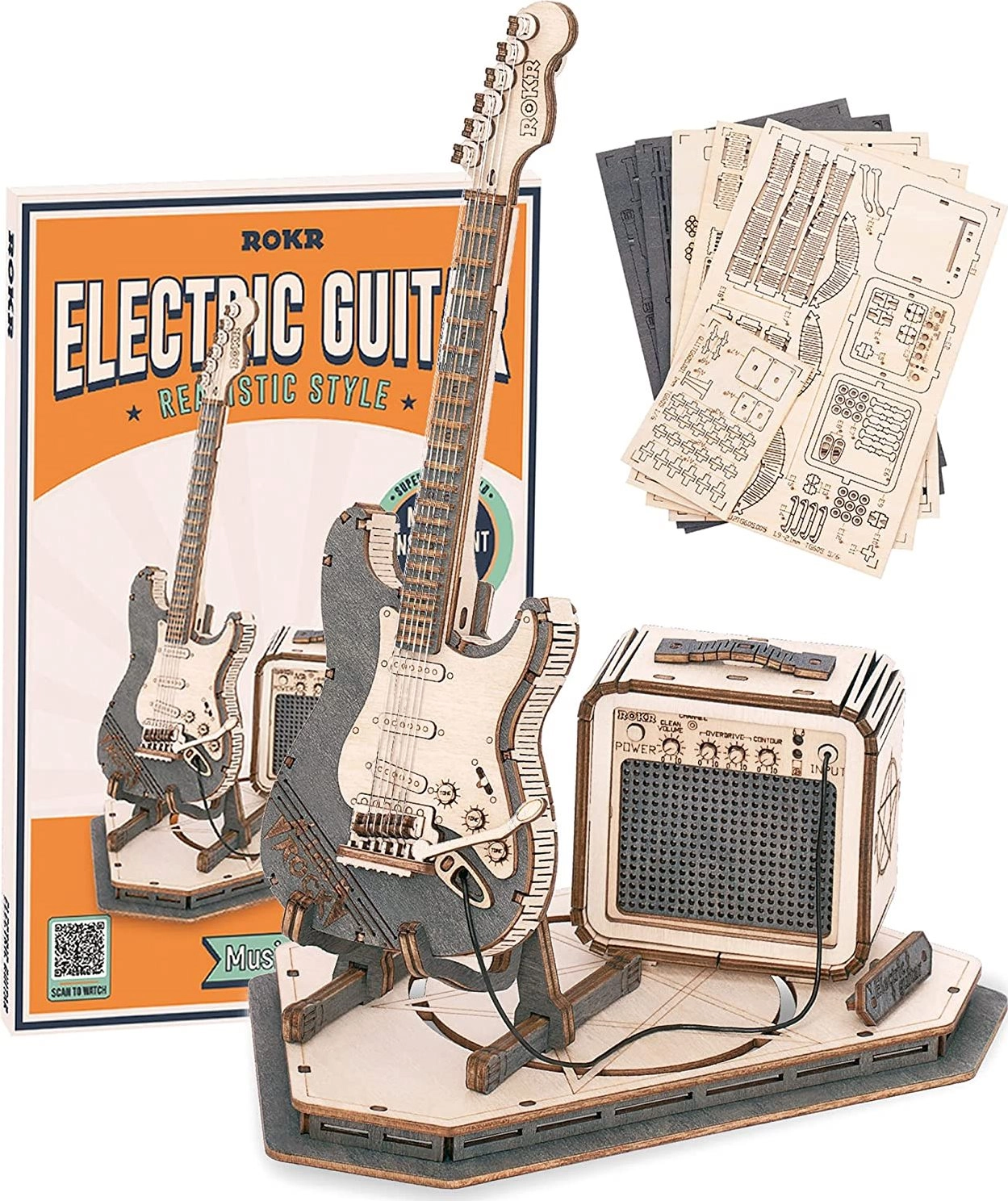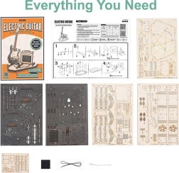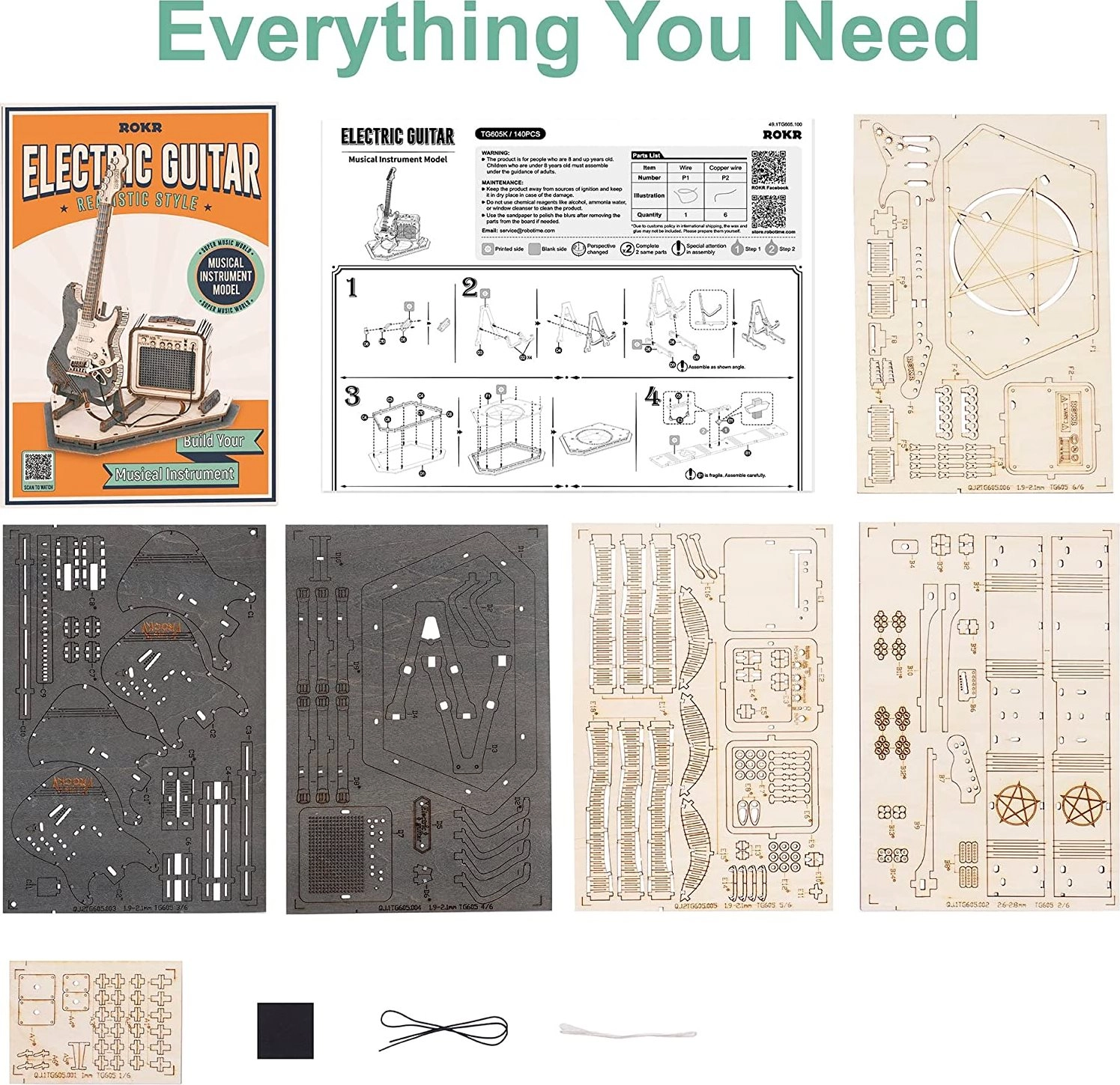 Rinkinyje yra 140 detalių su žemu sudėtingumu, todėl puikiai tinka pradedantiesiems ir vyresniems vaikams. Dėl aiškios instrukcijos gitarą surinksite maždaug per 1,5 val. Galutinis rezultatas – realistinis elektrinės gitaros su stiprintuvu modelis, puiki dovana muzikos entuziastams.