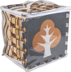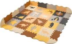 Kilimėlį galima naudoti kaip didelę žaidimų dangą 143 × 143 cm arba surinkti aptvarą 113 × 113 × 16 cm. Minkštos EVA putos sugeria smūgius, izoliuoja nuo šalčio ir neslysta. Medžiaga lengvai valoma – pakanka nuvalyti drėgna šluoste. Elegantiška neutrali paletė dera su moderniu interjeru ir gali pakeisti kilimą vaikų kambaryje.