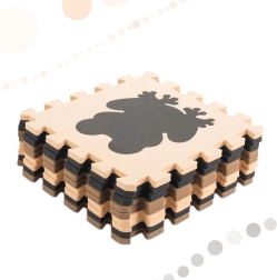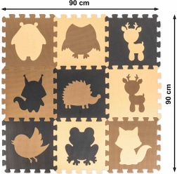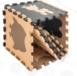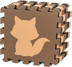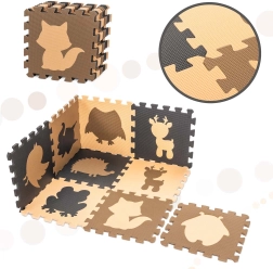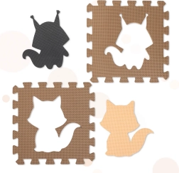 Minkštas ir saugus vaikų kilimėlis iš patvarios EVA putos, neutralių smėlio ir rudos atspalvių. Rinkinį sudaro 9 dalys su išimamais gyvūnų formų intarpais – sudėjus gaunamas 85 × 85 cm plotas, taip pat galima konstruoti 3D formas. Apsaugo nuo šalčio, slopina smūgius, yra atsparus vandeniui ir lengvai valomas. Idealu pirmiesiems žingsniams, žaidimams ir formų pažinimui.
