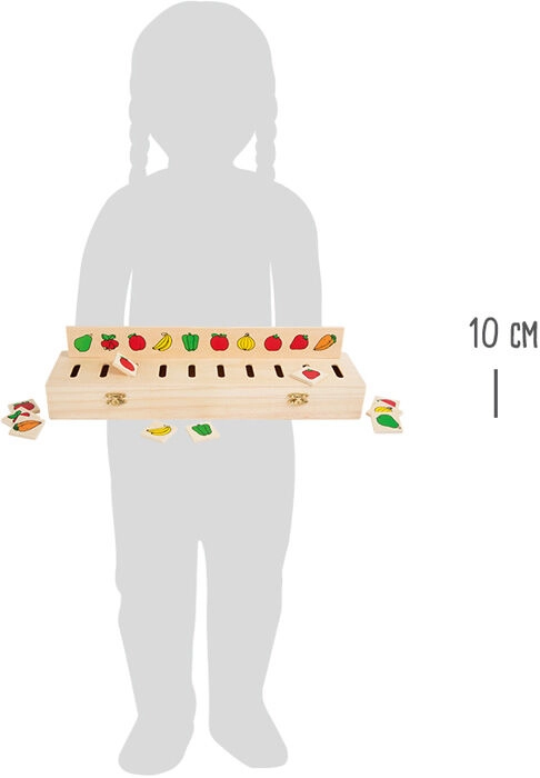 Ši kokybiška Small Foot medinė motorinė rūšiavimo dėlionė yra puikus pasirinkimas vaikų smulkiajai motorikai, logikai ir žodynui lavinti. Vaikai priskiria kvadratėlius su motyvais prie tinkamų angų įstatomose plokštėse ir žaismingai mokosi atpažinti spalvas, formas bei kasdienius daiktus.