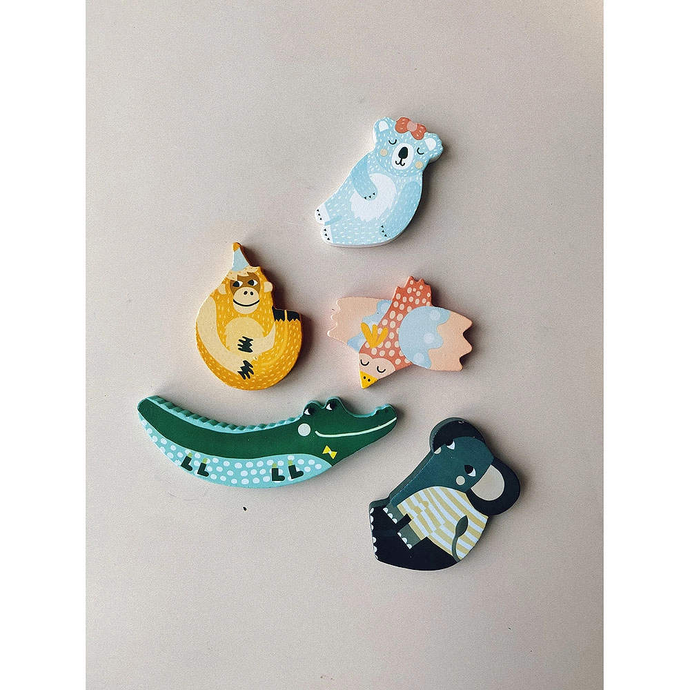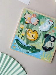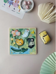 Michelle Carlslund dizainas švelniomis pastelinėmis spalvomis suteikia žaislui patrauklią išvaizdą ir skatina vaizduotę. Medinė bazė su išpjovomis ir gyvūnų motyvais moko vaikus derinti formas, atpažinti spalvas ir gyvūnus. Dėlionė patvari, saugi ir pagaminta iš kokybiškos medienos derinant su tekstile.