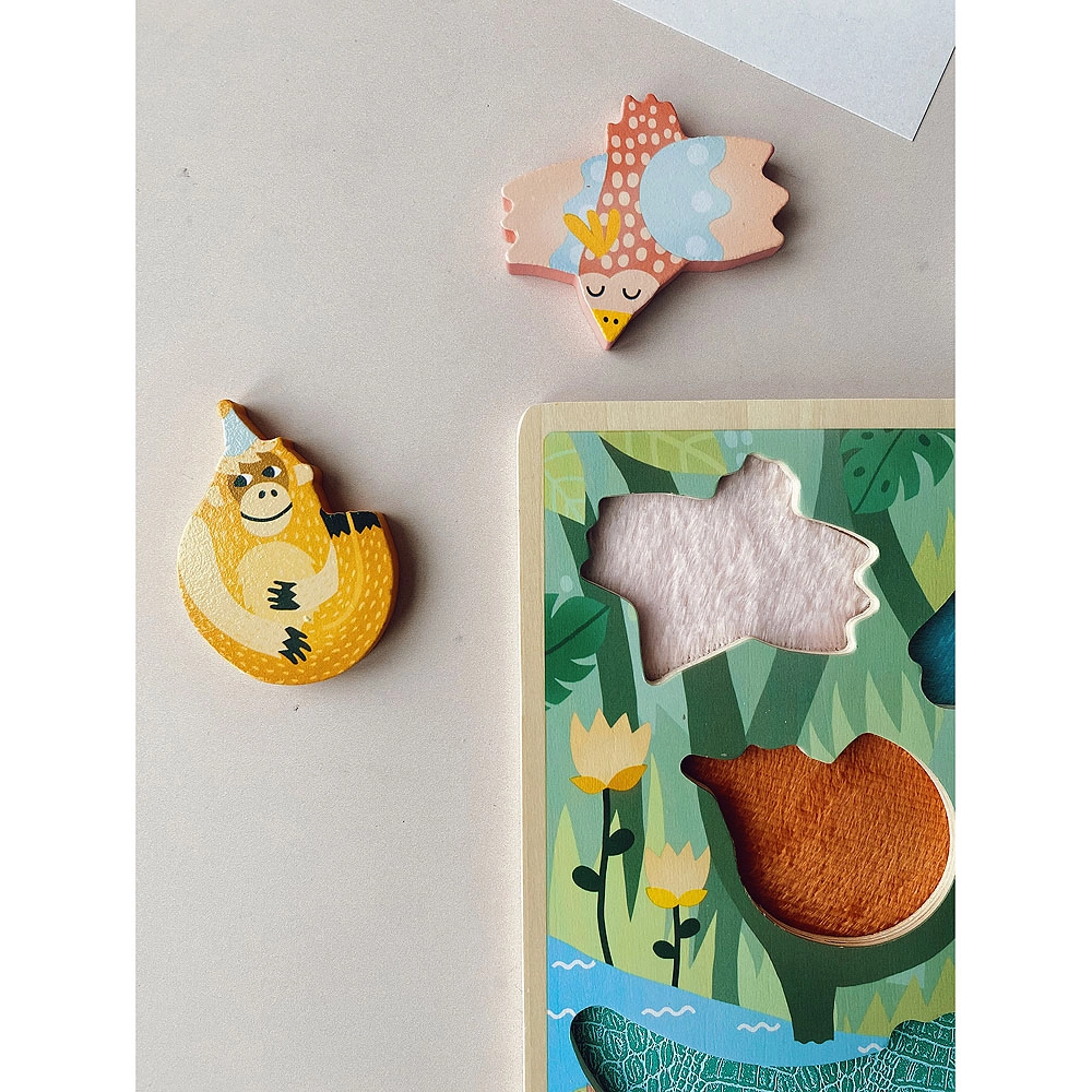 Ši kokybiška medinė dėlionė vaikams suteikia džiaugsmo atrandant ir mokantis. Išėmus kiekvieną gyvūnėlį, po detale vaikai ras skirtingą lytėjimo paviršių – švelnų, šiurkštų ar faktūrinį, kuris natūraliai lavina lytėjimo pojūčius ir stiprina sensorinę integraciją. Tvirtos, lengvai sugriebiamos detalės puikiai tinka mažoms rankutėms.