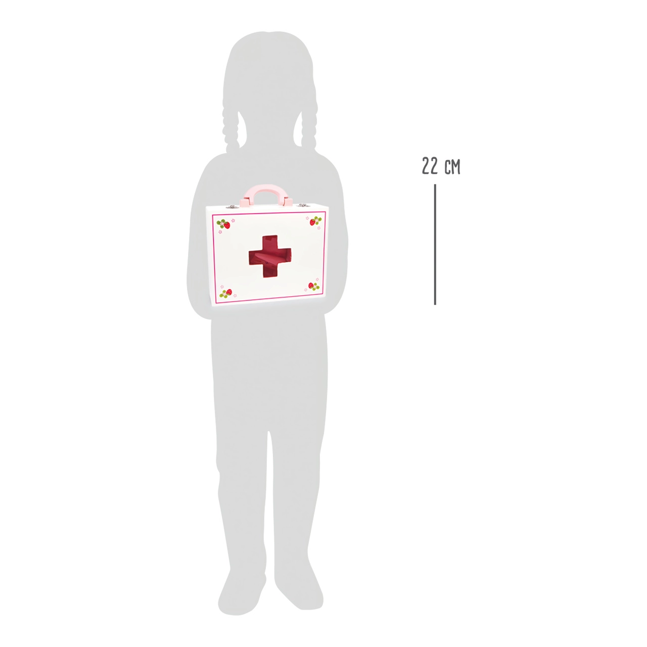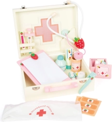 Aukštos kokybės medinis gydytojo lagaminėlis Small Foot Isabel puikiai tinka vaikų vaidmenų žaidimams. Rinkinyje yra 24 vnt. priedų, įskaitant tekstilinę galvos juostą su raudonu kryžiumi ir spalvingus medicinos įrankius su braškių motyvu, kurie pradžiugins kiekvieną vaiką.