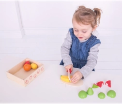 Realistiška pjaustymo lentelė ir medinis peilis leidžia žaisti virtuvę be rizikos. Vaisių dalys laikosi kartu ir pjaunant lengvai atskiriamos.