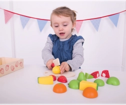 „Pjaustydami“ medinius vaisius saugiu peiliu, vaikai lavina suėmimą, akių–rankų koordinaciją ir judesių tikslumą.
