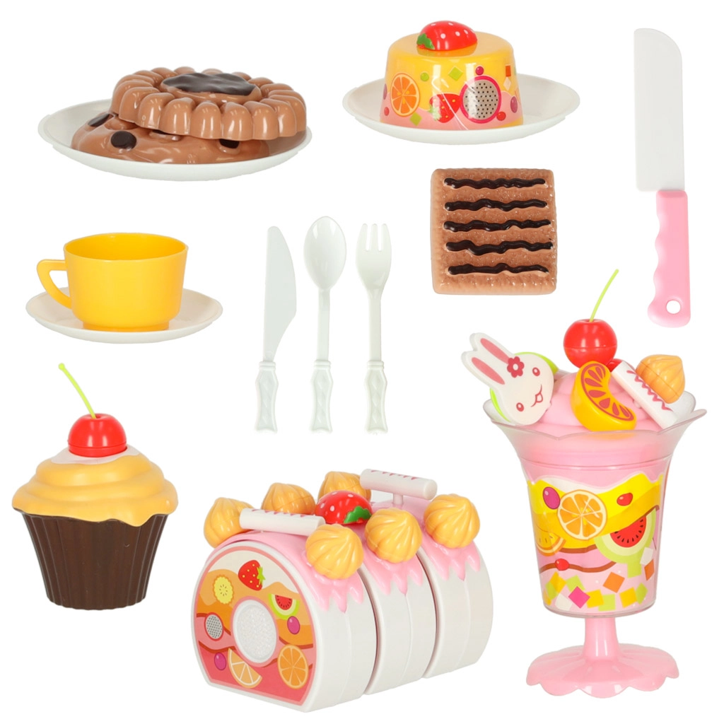 Be torto yra sausainiai, vyniotiniai, keksiukas, ledų taurė ir įrankiai – viskas tikroviškam šventės žaidimui.