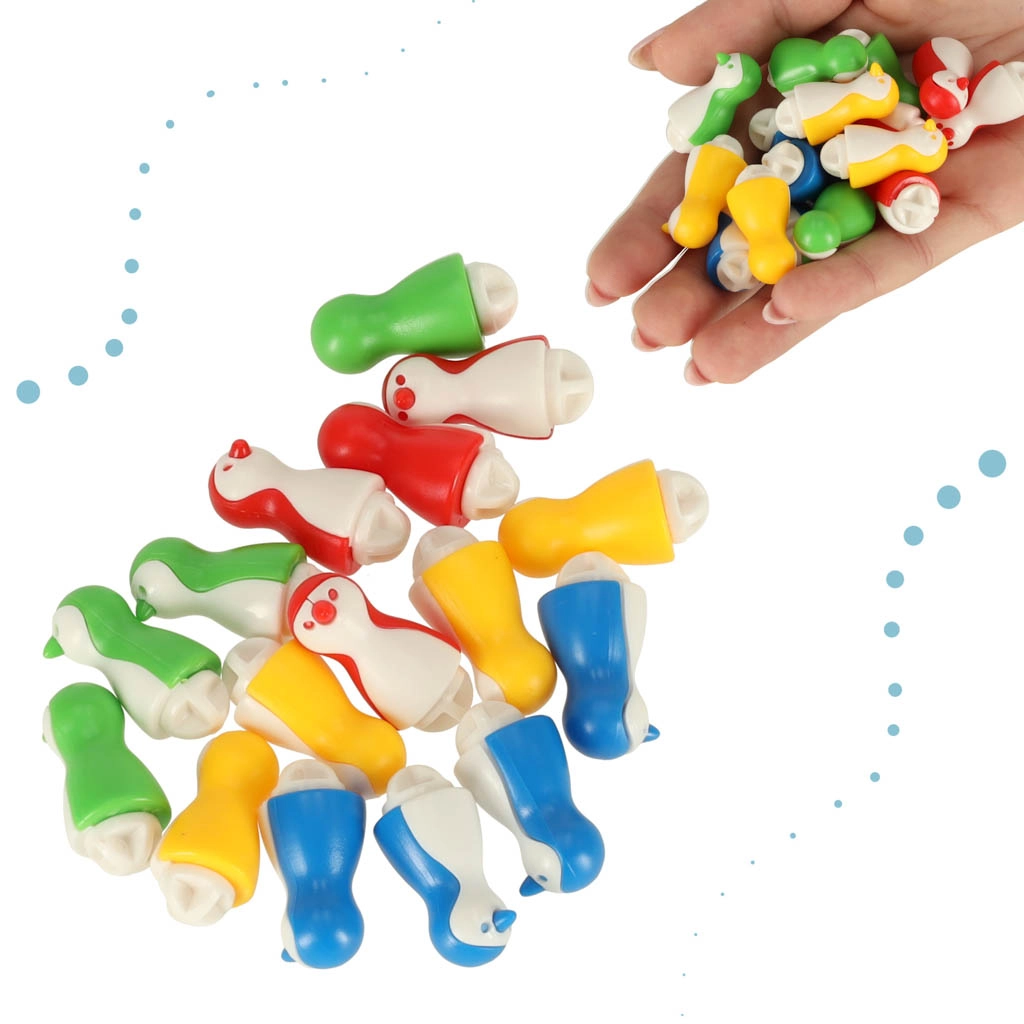Rinkinyje yra 16 pingvinų figūrėlių keturiomis spalvomis – mėlyna, geltona, žalia ir raudona – aiškiam ir smagiam žaidimui.