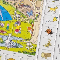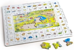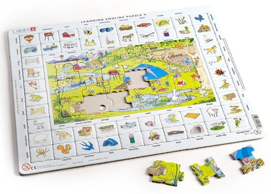 Larsen dėlionė Anglų kalba skirta tiems, kurie mėgsta mokytis žaismingai. Pievoje už kaimo ar prie tvenkinio galite atrasti įvairius personažus ir daiktus, reikalingus stovyklavimui. Prie abėcėlės tvarka išdėstytų angliškų pavadinimų dėlionės kraštuose priderinami atitinkami paveikslėlių gabalėliai.