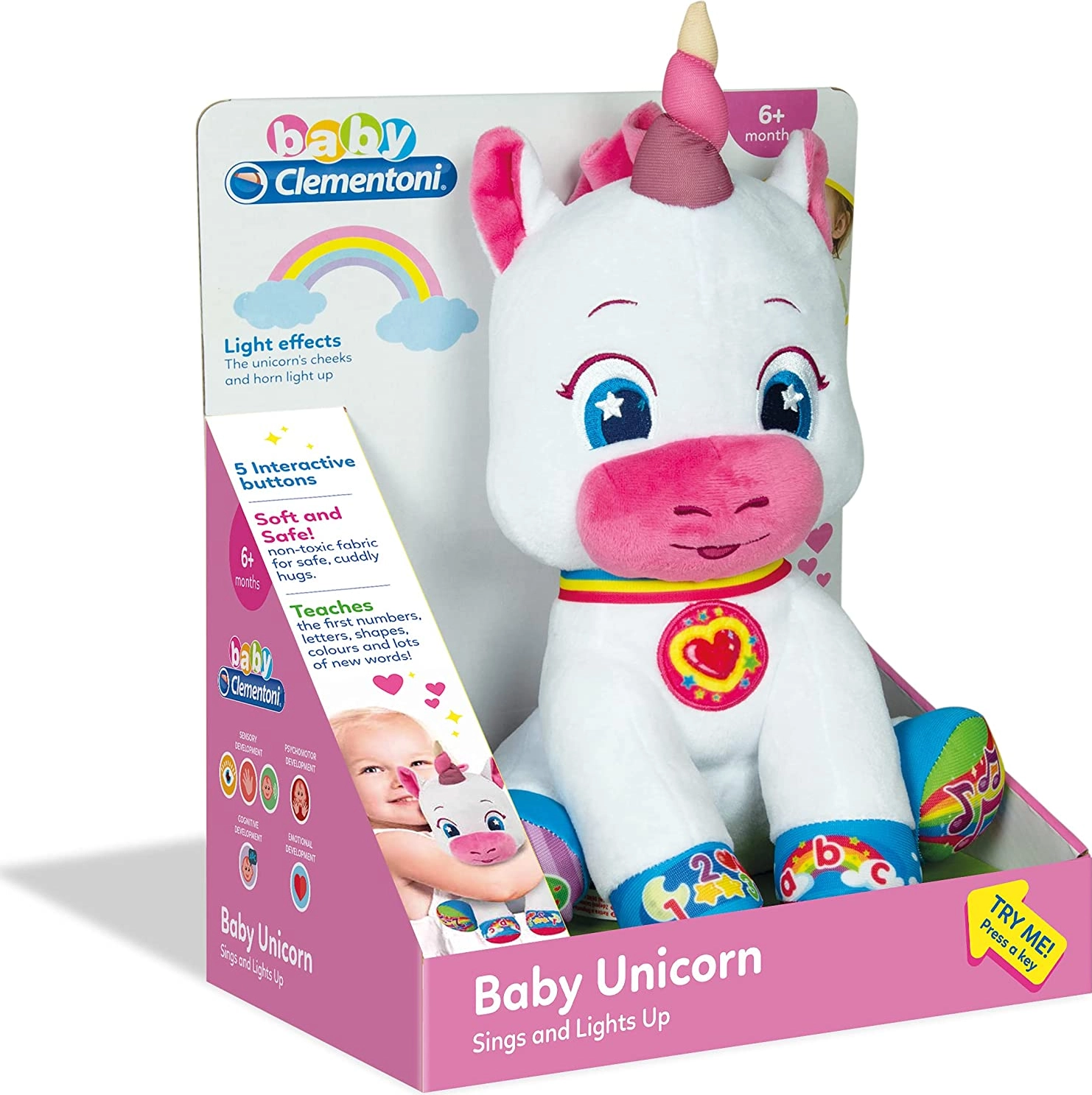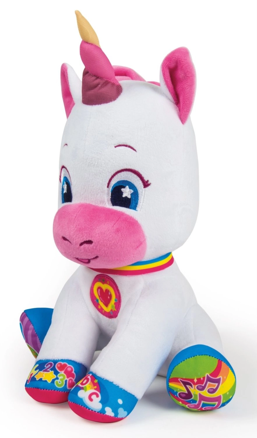 Mielas vienaragis iš BABY CLEMENTONI siūlo mokymąsi žaidžiant patiems mažiausiems. Jis turi 5 interaktyvius mygtukus skirti mokytis skaičių, raidžių, formų ir spalvų, kalba čekų (galima perjungti į slovakų), groja daineles ir eilėraštukus, o jo skruostai ir ragas šviečia. Minkštas pliušas skatina lytėjimo ir klausos pojūčius bei pirmąsias logines sąsajas.
