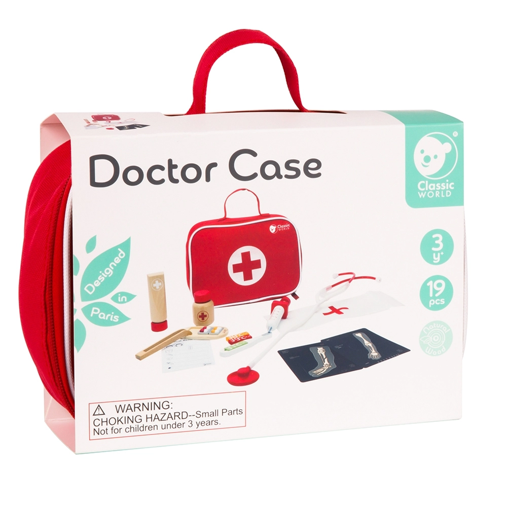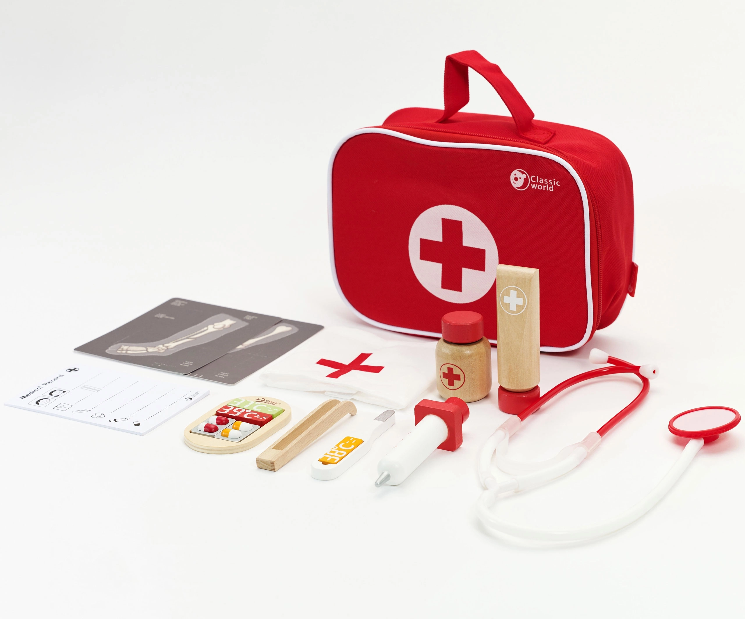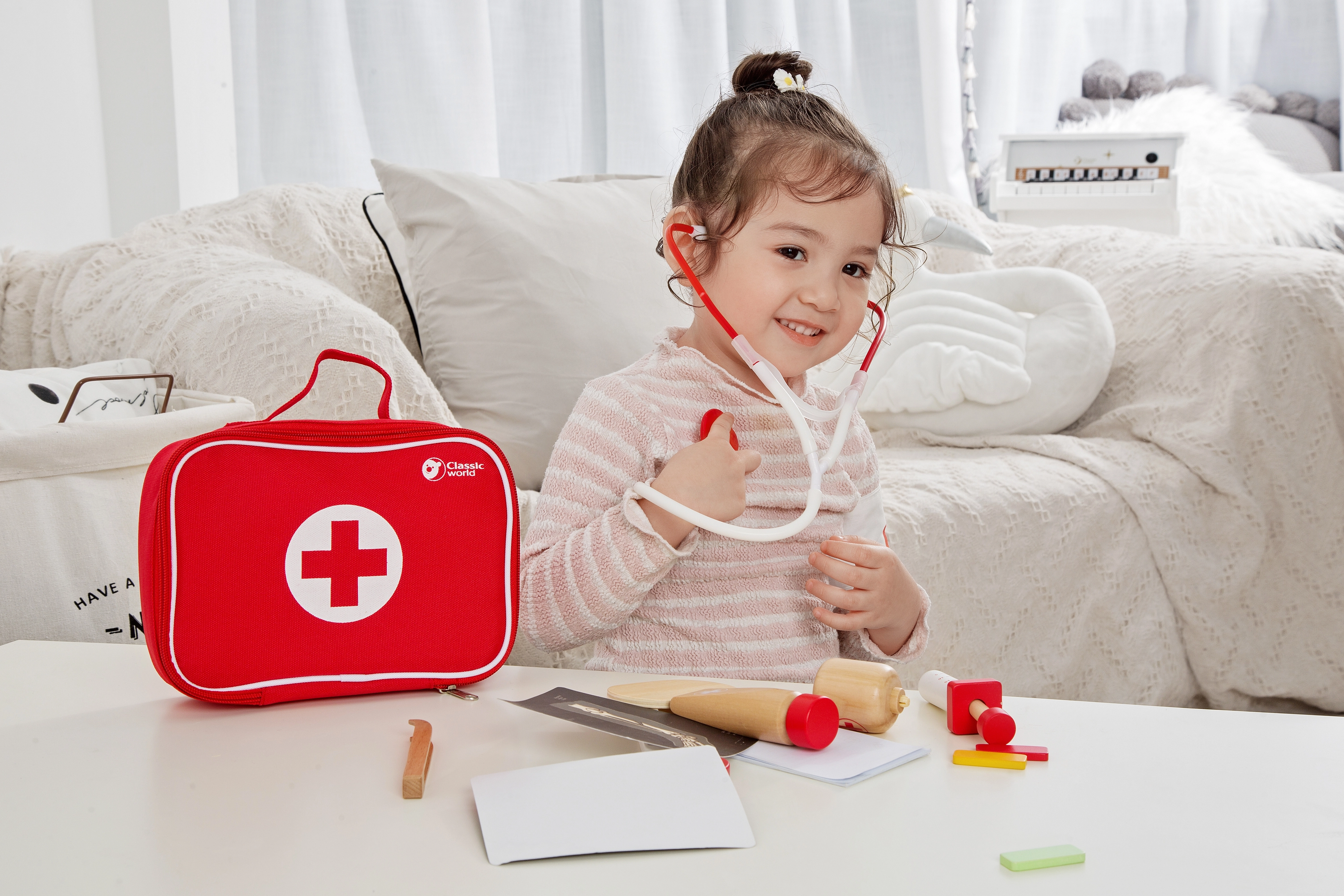 Rinkinys iš Classic World turi viską, ko mažajam gydytojui reikia žaidžiant gydytoją. Vaikai gali klausytis pacientų (pliušinių meškučių, lėlių) širdies plakimo su stetoskopu, „matuoti“ temperatūrą termometru, „leisti“ injekcijas ar duoti reikalingus vaistus. Gydytojo vaidmenų žaidimas – ne tik mėgstamas užsiėmimas, bet ir empatijos bei įsitraukimo pamoka, itin svarbi socialiniams santykiams. Šis rinkinys skatina vaizduotę ir moko spręsti problemas.