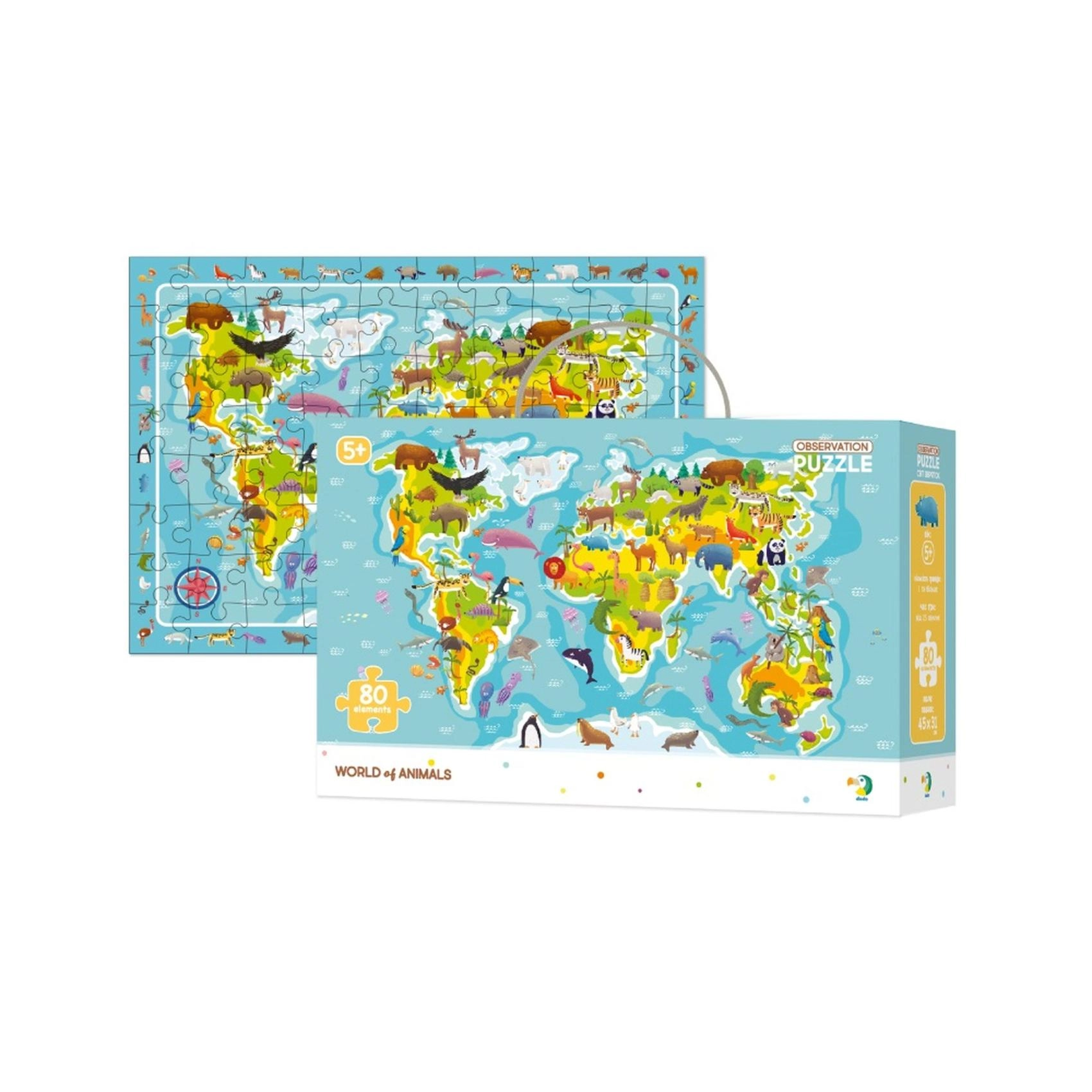 Atraskite faunos pasaulį su šiomis spalvingomis dėlionėmis, kurios ne tik pralinksmins vaikus, bet ir juos mokys. Sudėję paveikslą, jie galės žaisti žaidimą Rask ir ieškok ir nustatyti gyvūnų vietas pasaulio žemėlapyje. Edukacinė dėlionė iš 80 detalių lavina dėmesį, smulkiąją motoriką ir loginį mąstymą.