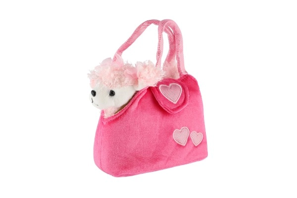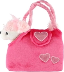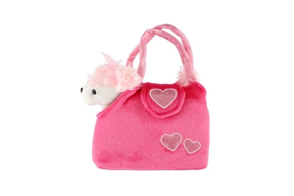 Žavus rinkinys mažosioms stileivoms: minkštutis pliušinis šuniukas, paslėptas rožinėje rankinėje su dekoratyvinėmis širdelėmis. Puikiai tinka kelionėms, vaidybiniams mamytės žaidimams ir glostymui – šuniuką bet kada galima išimti iš rankinės.