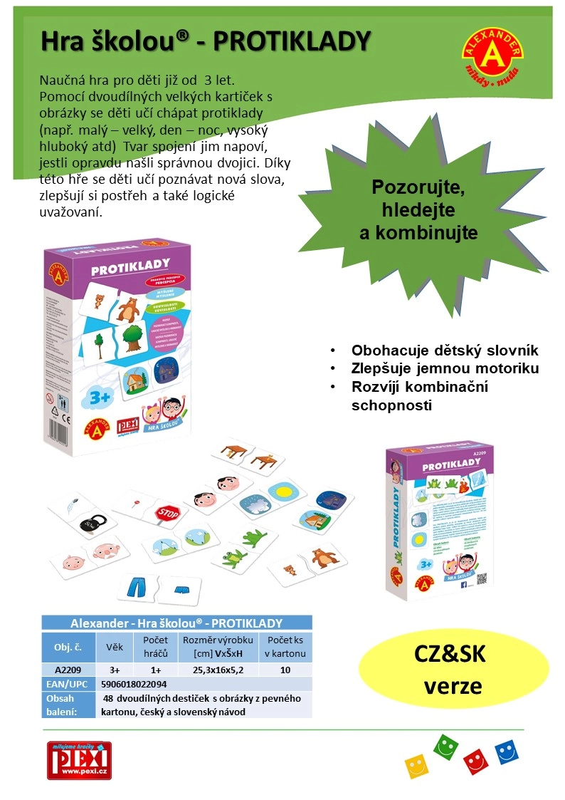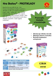 48 dviejų dalių lentelės su paveikslėliais, žaidimo instrukcija čekų ir slovakų kalbomis