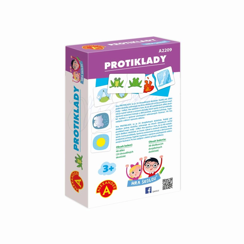 Smagus edukacinis žaidimas patiems mažiausiems, padedantis vaikams suprasti priešybes naudojant dideles dviejų dalių korteles. Dėl unikalaus sujungimo formos vaikai iš karto supranta, ar rado tinkamą porą. Lavina žodyną, loginį mąstymą, dėmesį ir smulkiąją motoriką.