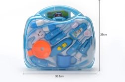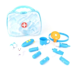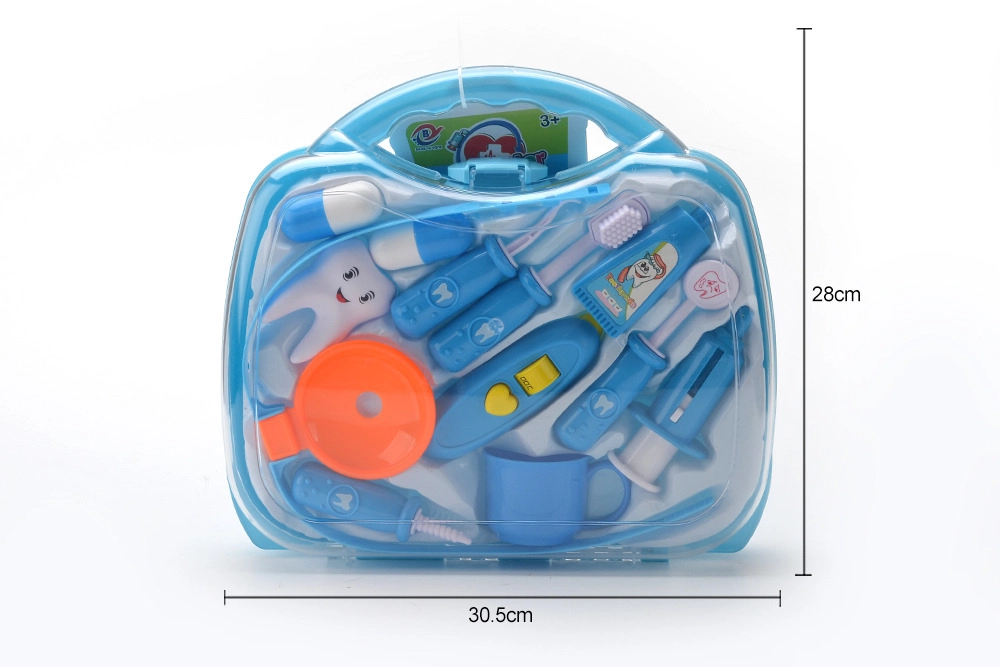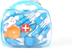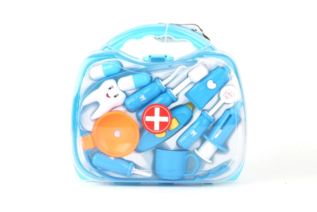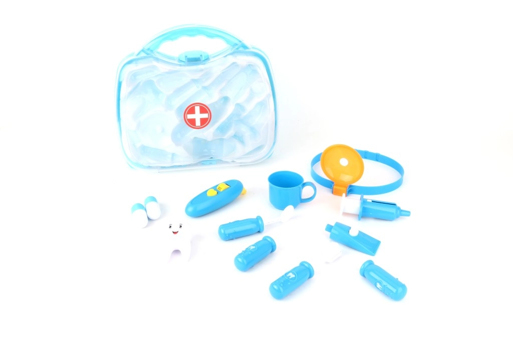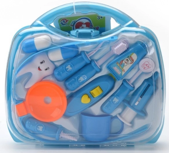 Skaidrus mėlynas lagaminėlis slepia įvairias dantų priežiūros priemones, įskaitant šepetėlį, „pastą“ ir dantų modelį. Puikiai tinka higieninių įgūdžių lavinimui ir kūrybiškam žaidimui „pas odontologą“.