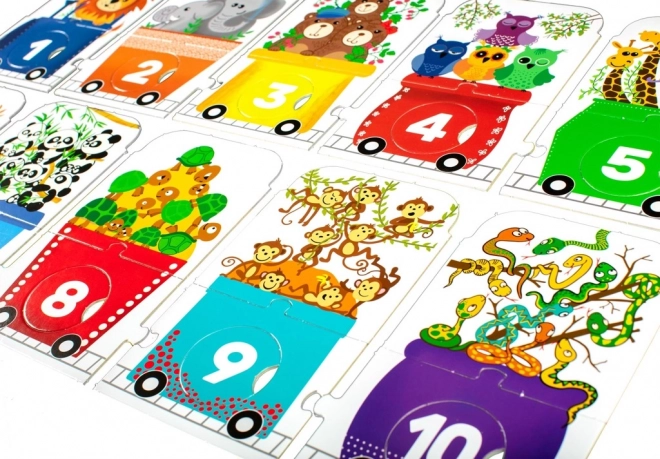 Vaikiška traukinio formos dėlionė yra smagus iššūkis mažiesiems tyrinėtojams. Ji susideda iš lokomotyvo ir devynių vagonų, kiekviename skirtingas gyvūnų skaičius: