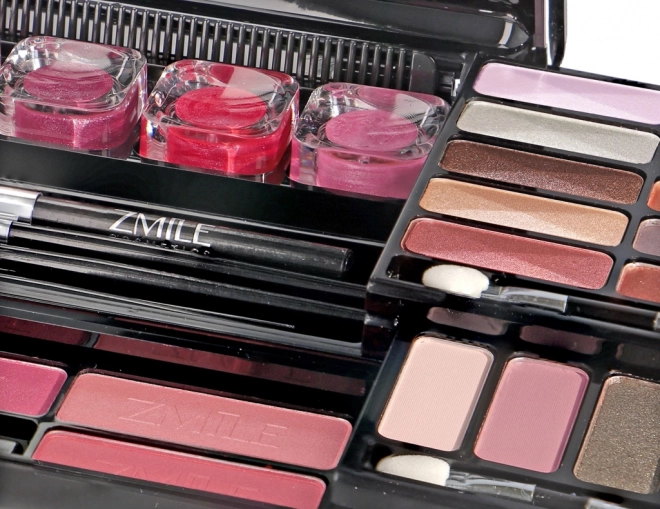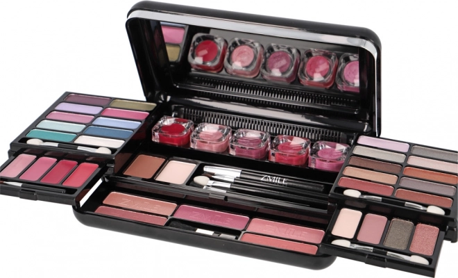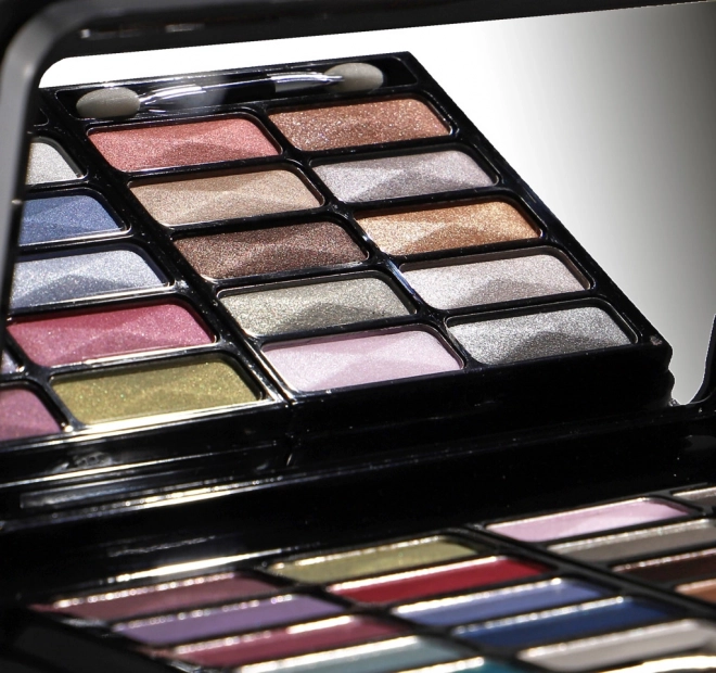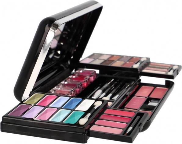 Elegantiškas juodas dėklas su veidrodėliu slepia pilną akių, veido ir lūpų makiažo rinkinį – idealu kelionėms ir kasdieniam naudojimui.