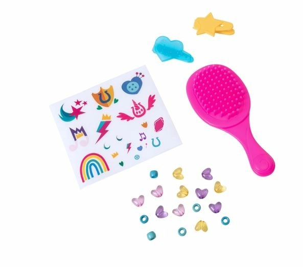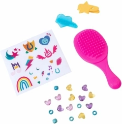 Rinkinyje yra platus priedų pasirinkimas, pavyzdžiui, šepetys, segtukai ir karoliukai, suteikiantys begalę šukuosenų ir dekoravimo galimybių.